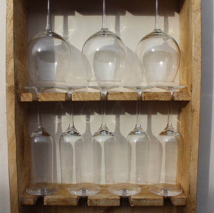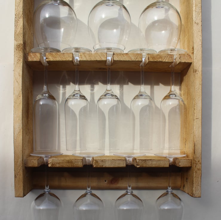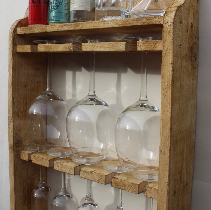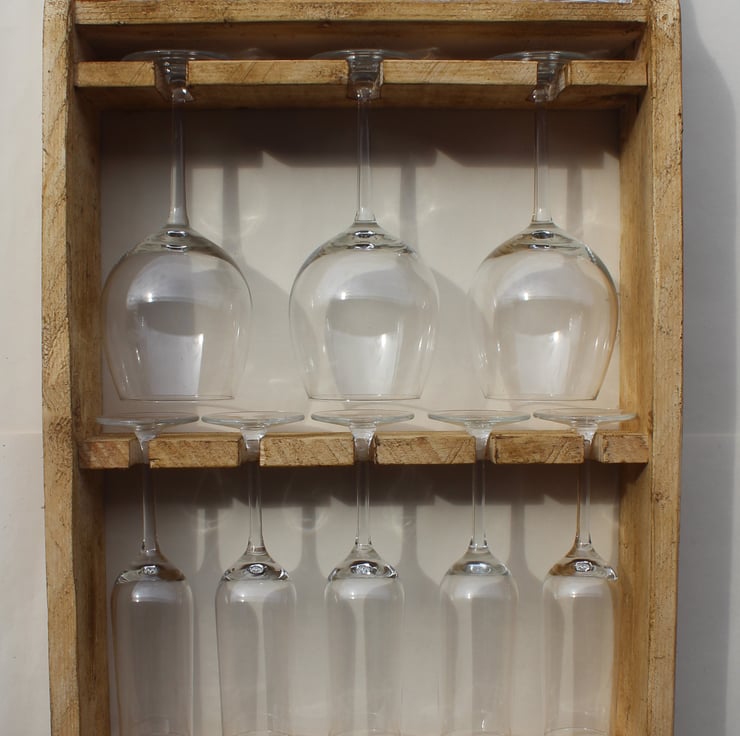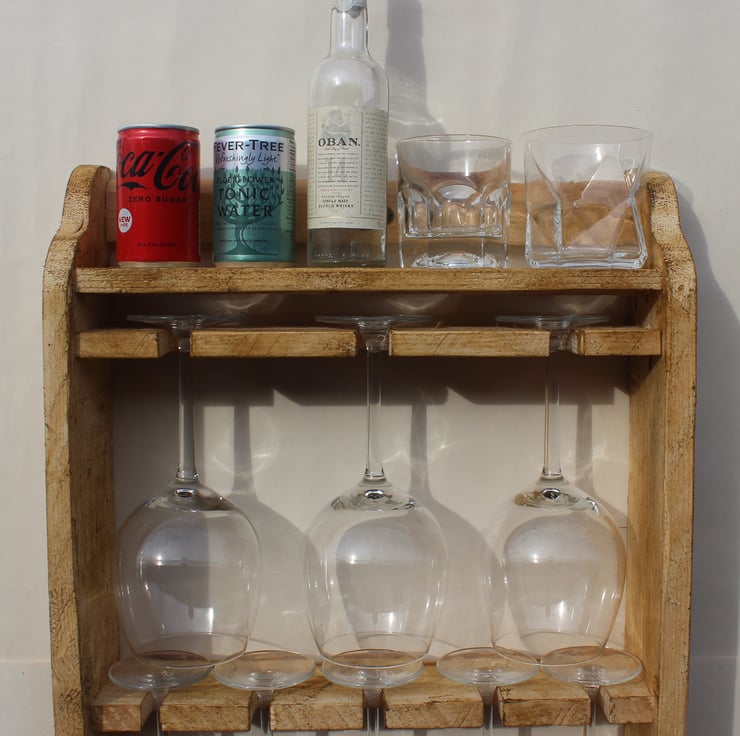 A wooden storage rack made to hold mixed wine & spirit glass's.