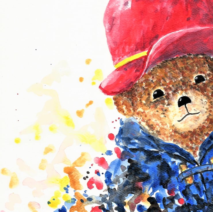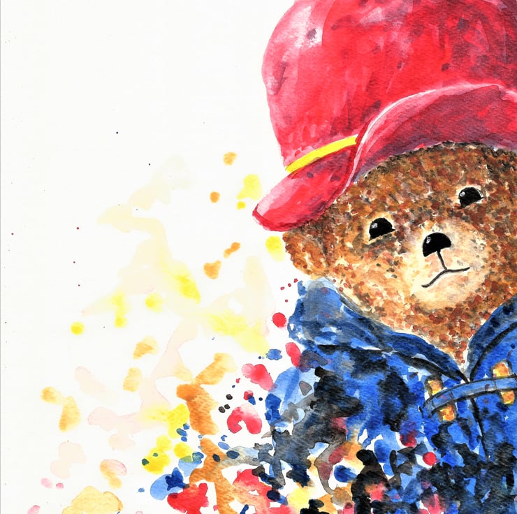 An original watercolor painting of a famous looking teddy Bear in a hat. Inspired by Paddy Bear this loose painting is made with skill and love.