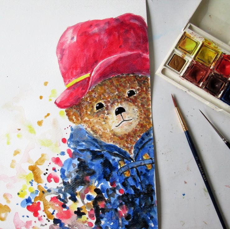 An original watercolor painting of a famous looking teddy Bear in a hat. Inspired by Paddy Bear this loose painting is made with skill and love.