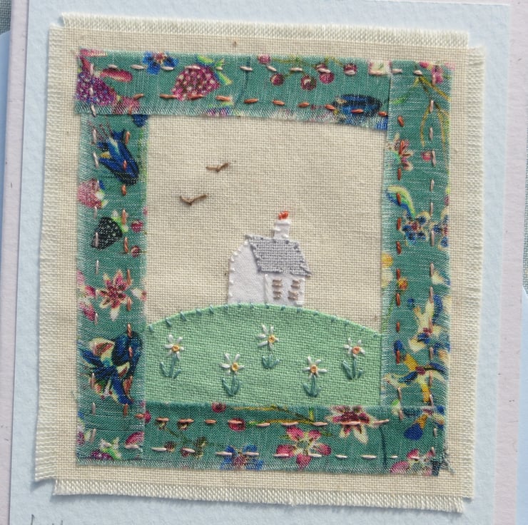 This is a small hand-stitched textile mounted onto a greeting card. I have hand-stitched everything with care and used a pretty Liberty cotton print for the border. The miniature applique is made with my own hand-dyed recycled cotton fabrics with finely embroidered details.