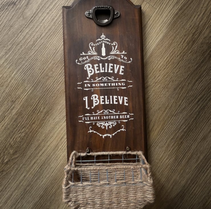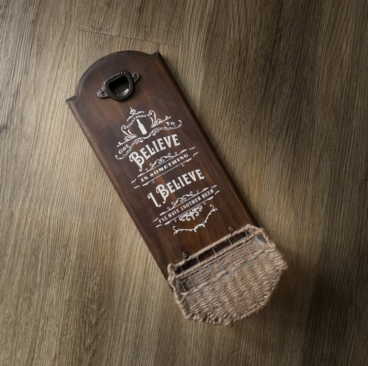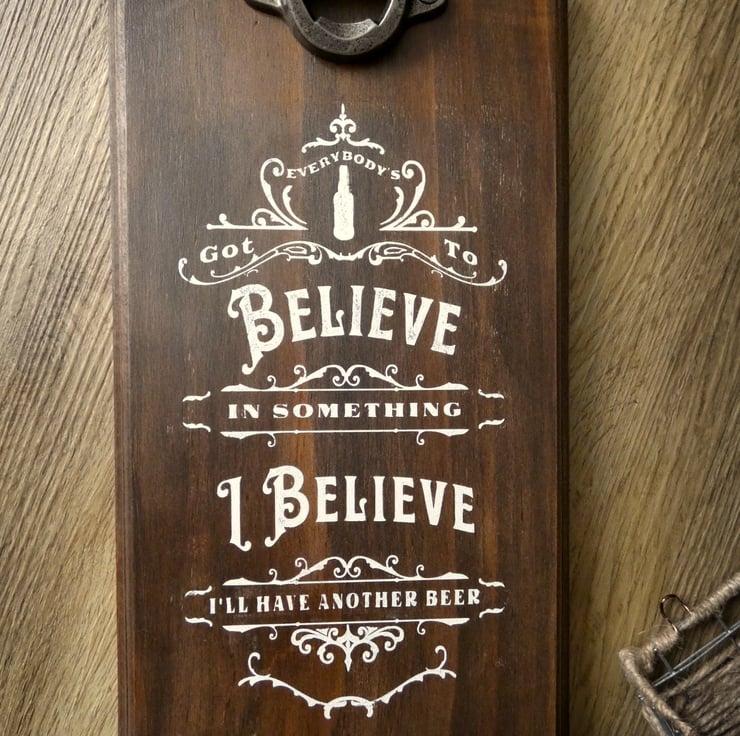 Wall mounted, rustic beer bottle opener with the hand painted quote, "Everybody's got to believe in something. I believe I'll have another beer."