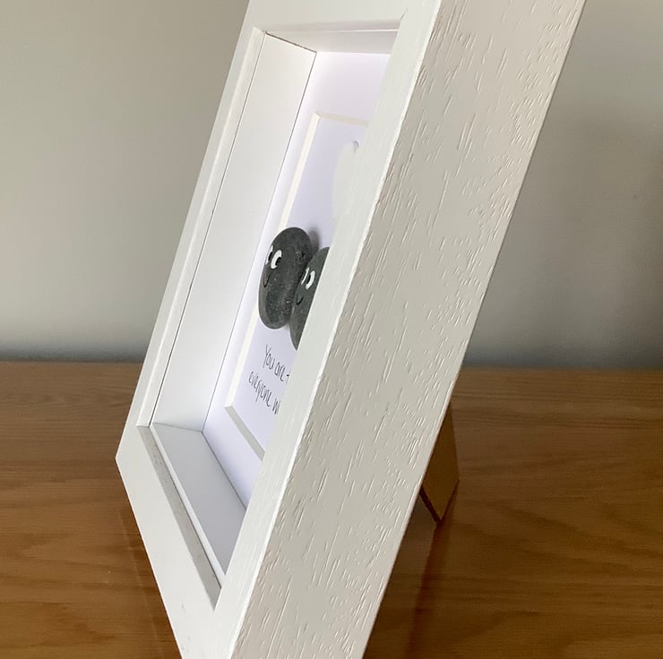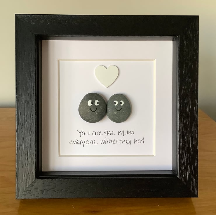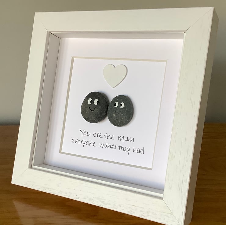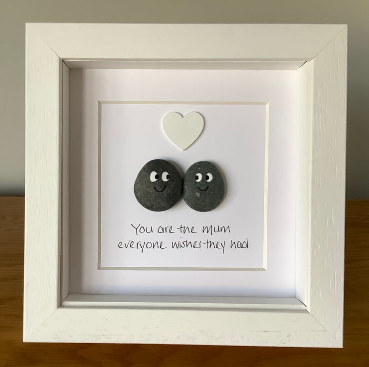 A lovely handmade fun pebble picture depicting a Mother and child with the handwritten words “You are the Mum everyone wishes they had” underneath with a white wooden heart.
