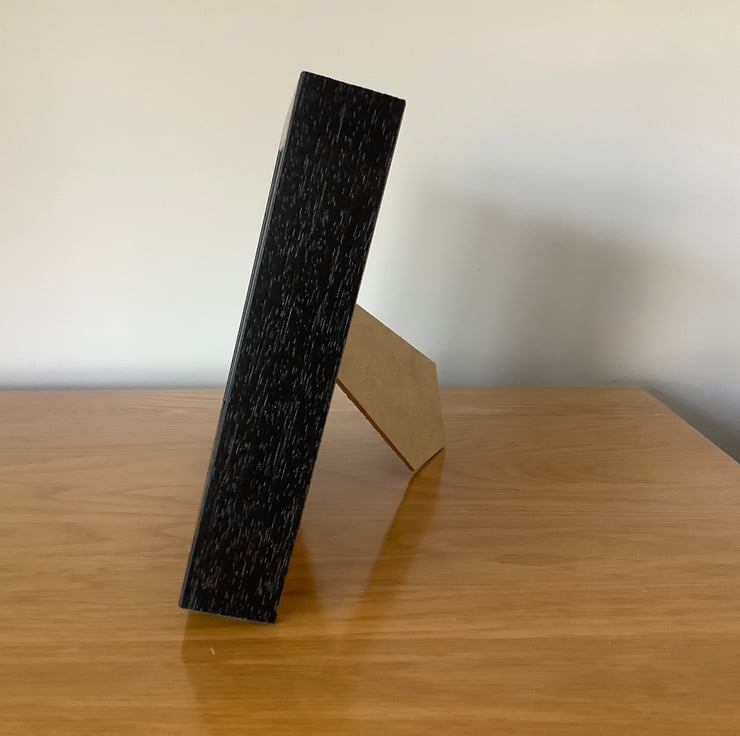 The black and white frame has a glass front and is 22.5cm x 18cm x 3cm and has a white and black mount and can be standing or wall hanging.