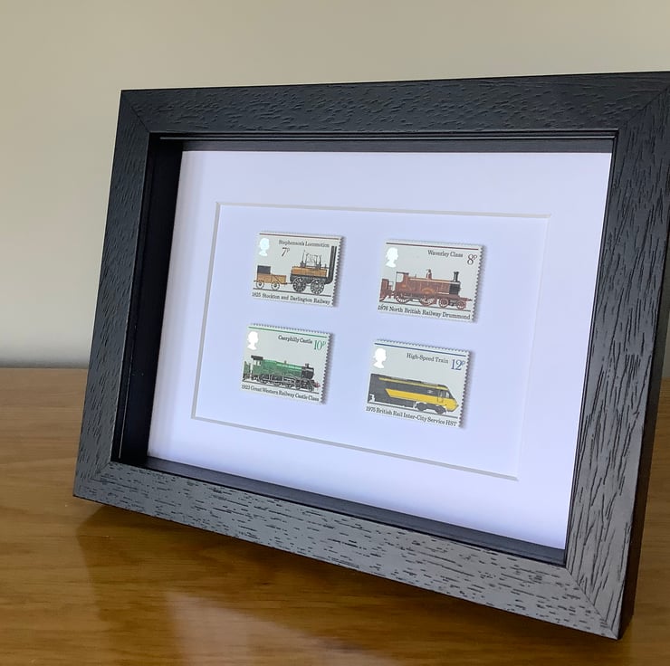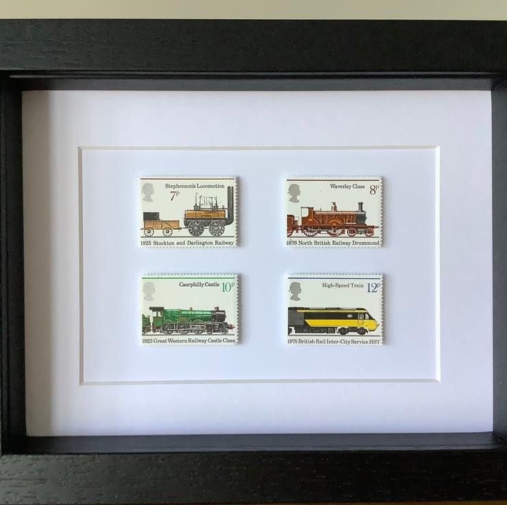 Framed genuine Royal Mail stamp set depicting the development of Britain’s railway. The stamps show the following engines: