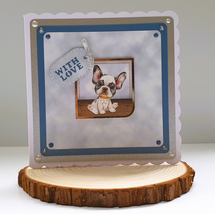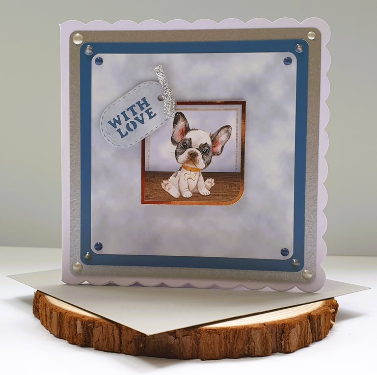 The French Bulldog puppy image topper and the "With Love" sentiment, are both mounted on foam pads to give dimension with the 3D effect.