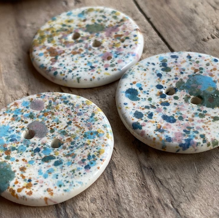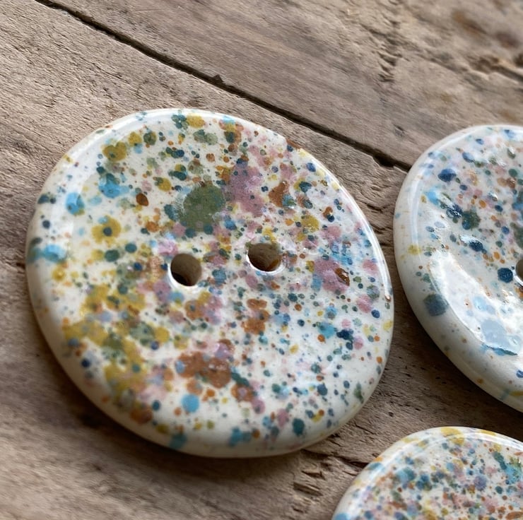 Each button has been decorated with a mixture of ceramic slips and glazes in a multitude of colours from Pink and Blue to Green and Orange, then topped with a transparent glaze to give a lovely glossy finish.