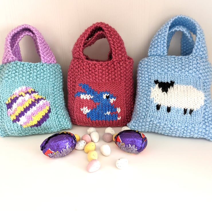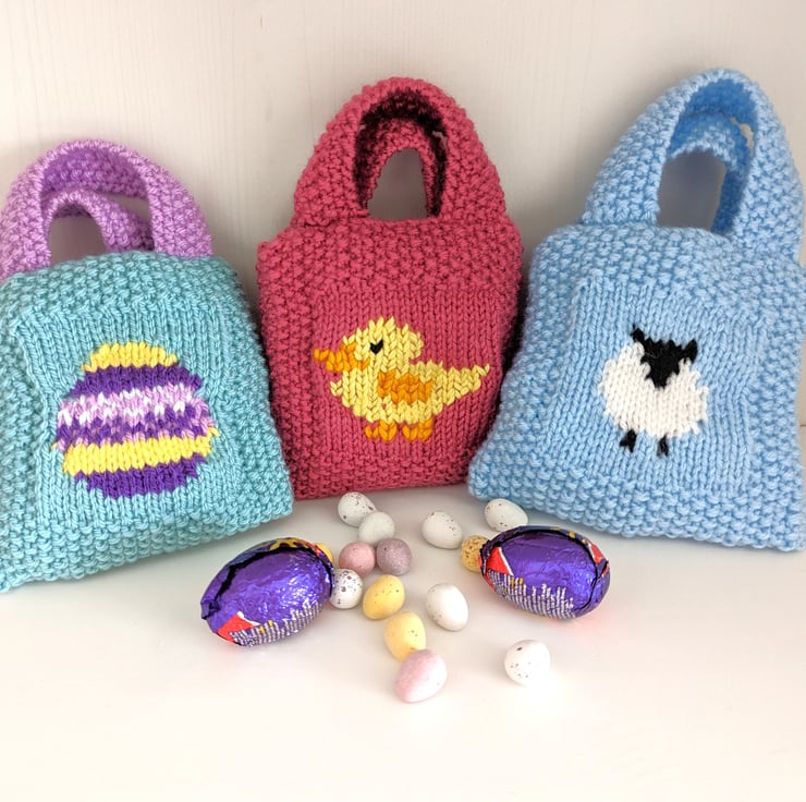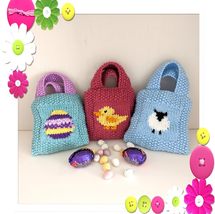 Knitting Pattern for Fun Goodie Bags for use on Easter egg hunts or for storing special treats.