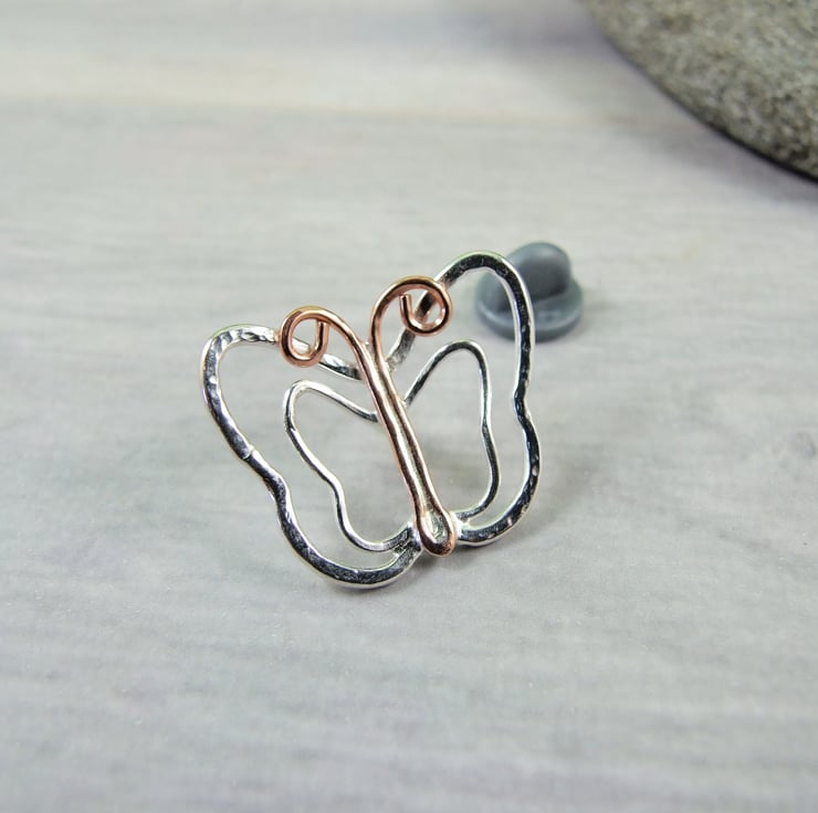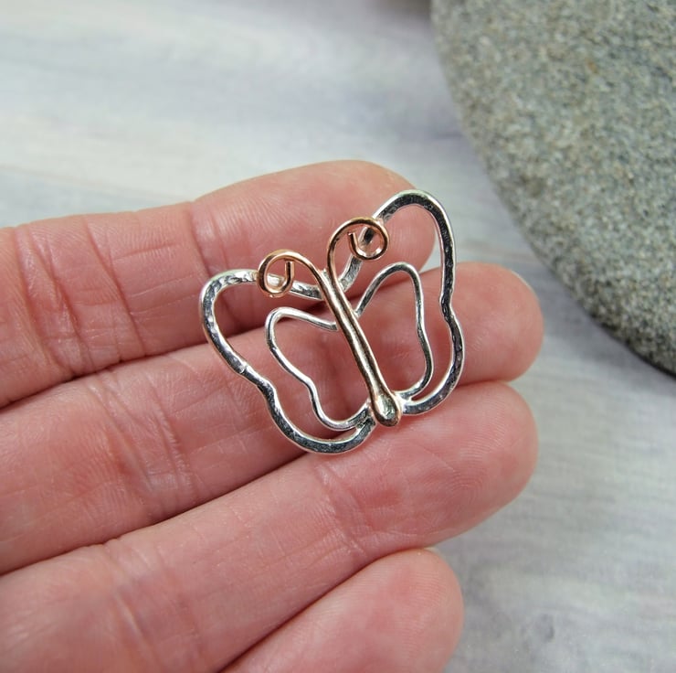 I created this lovely butterfly using copper and recycled sterling silver wire and shaped the putline of the butterfly by hand then soldered together. Soldered to a pin and push back.