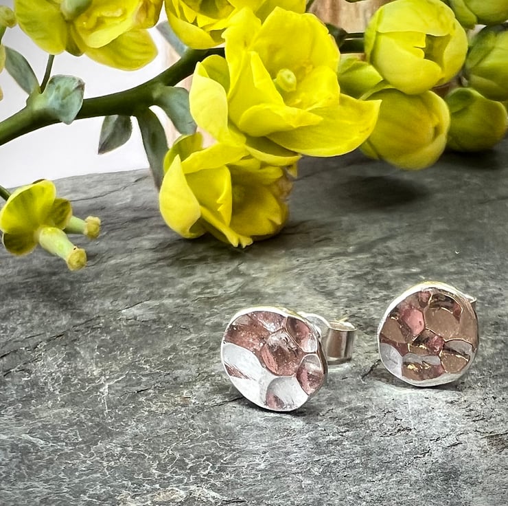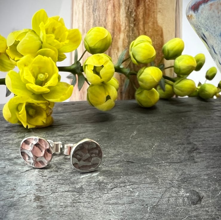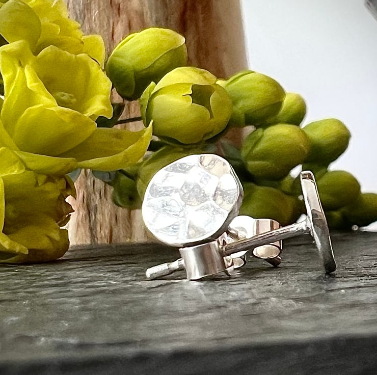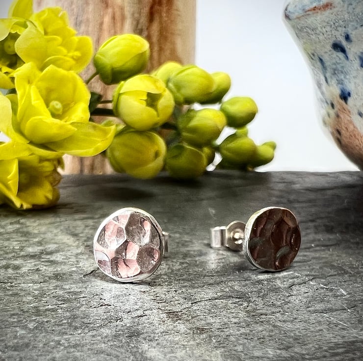 These beautiful every day earrings are made from recycled 925 sterling silver. Hammered with a distinctive pattern which is then buffed and finished to a sparkling shine.