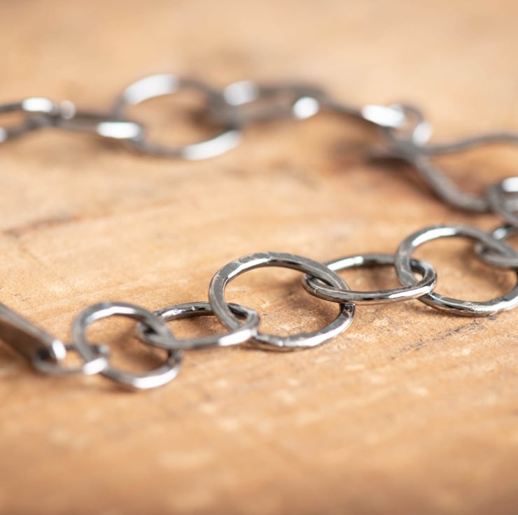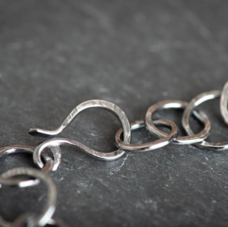 I have made each chain link individually, and they are not-quite-circles, giving it an organic feel. I have then used an old hammer to texture each one.