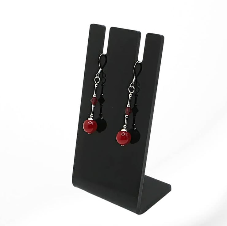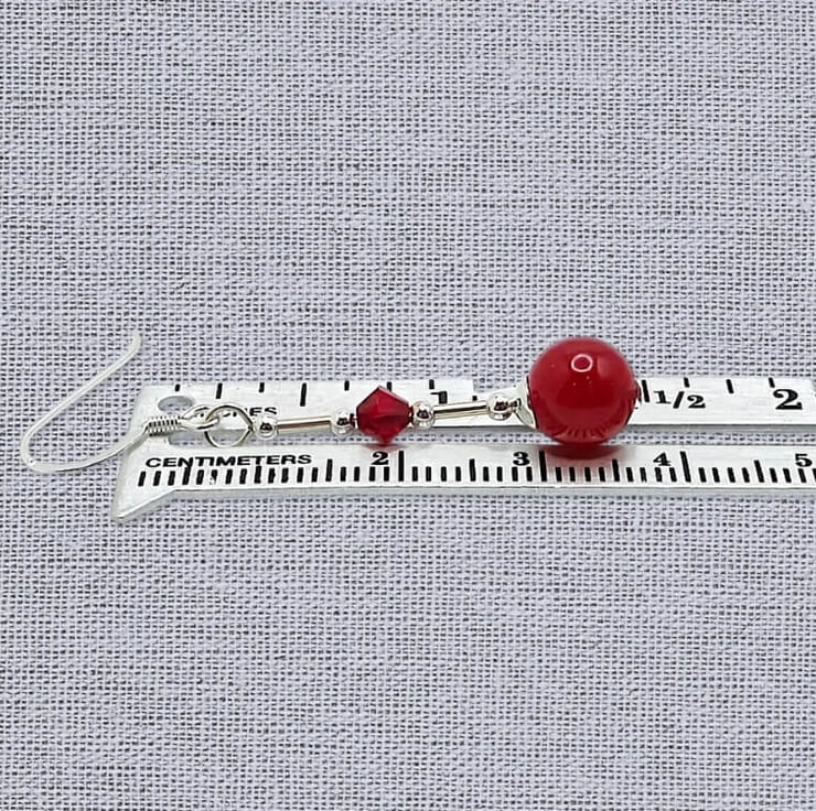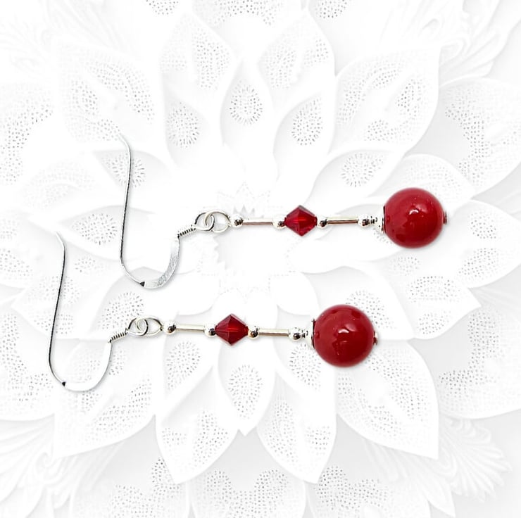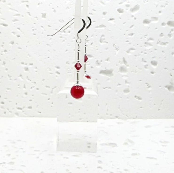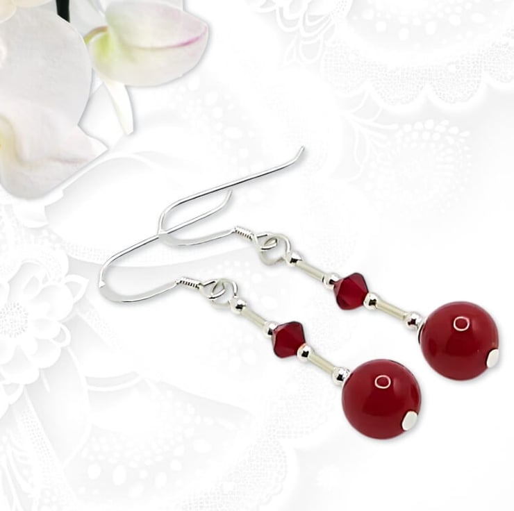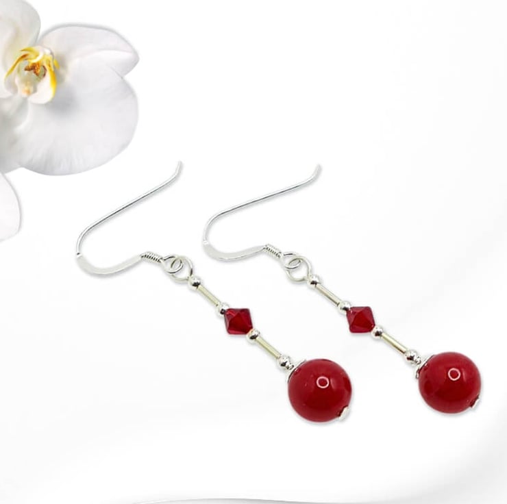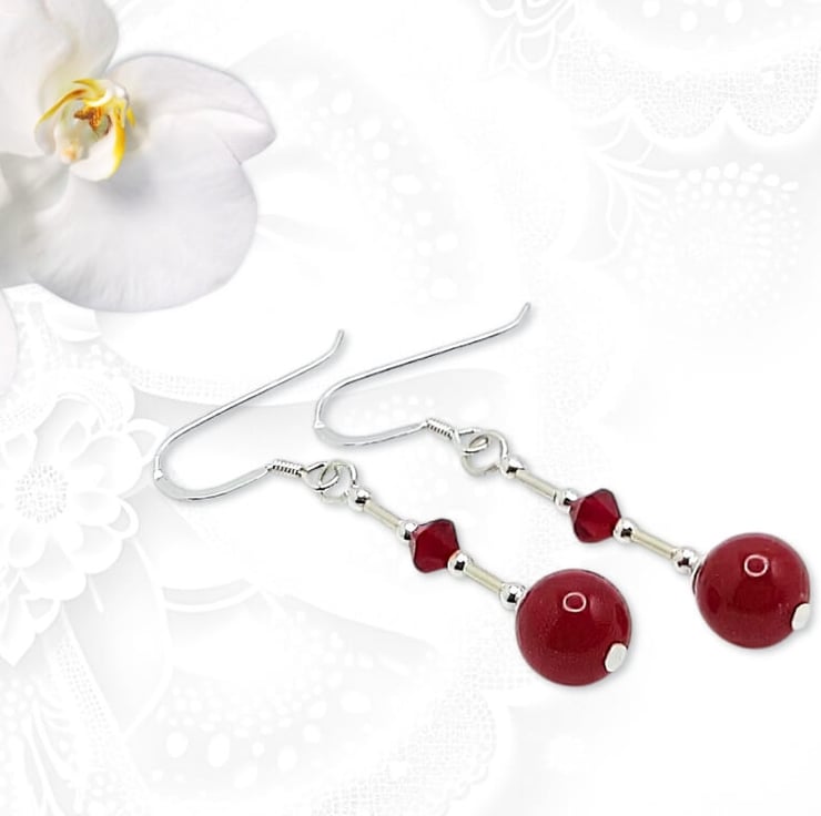 Ruby red Jade semi precious gemstone earrings handmade with toning premium Crystals from Austria & Sterling Silver tubes. Makes an elegant earrings gift for ladies.