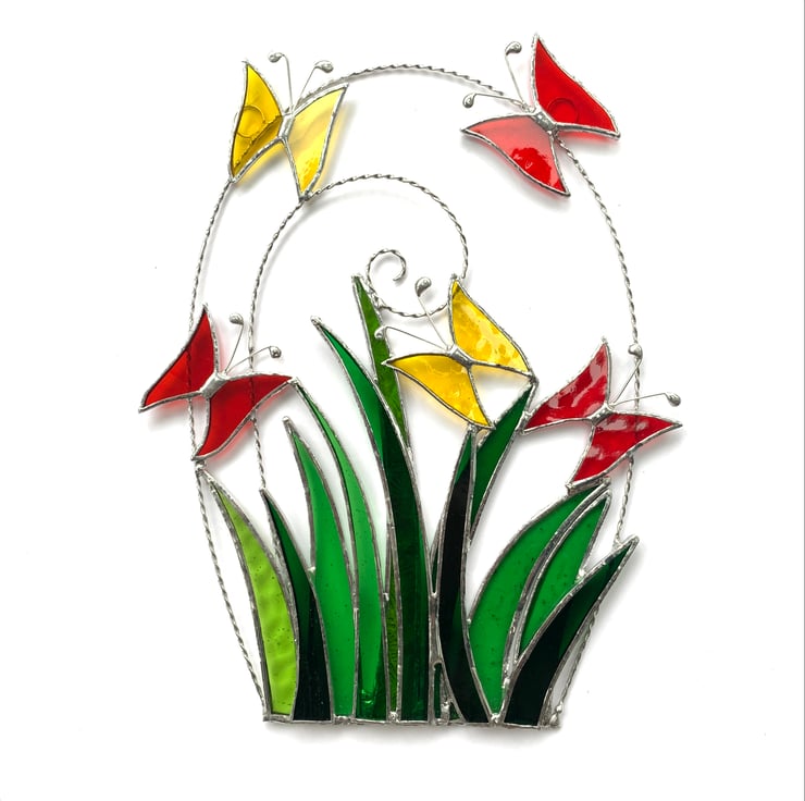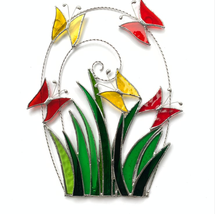 The grasses have been made from several types of green stained glass. The butterflies have been made from yellow water glass, yellow corella glass, red sea glass, red rough rolled glass and red/orange wissmach glass.