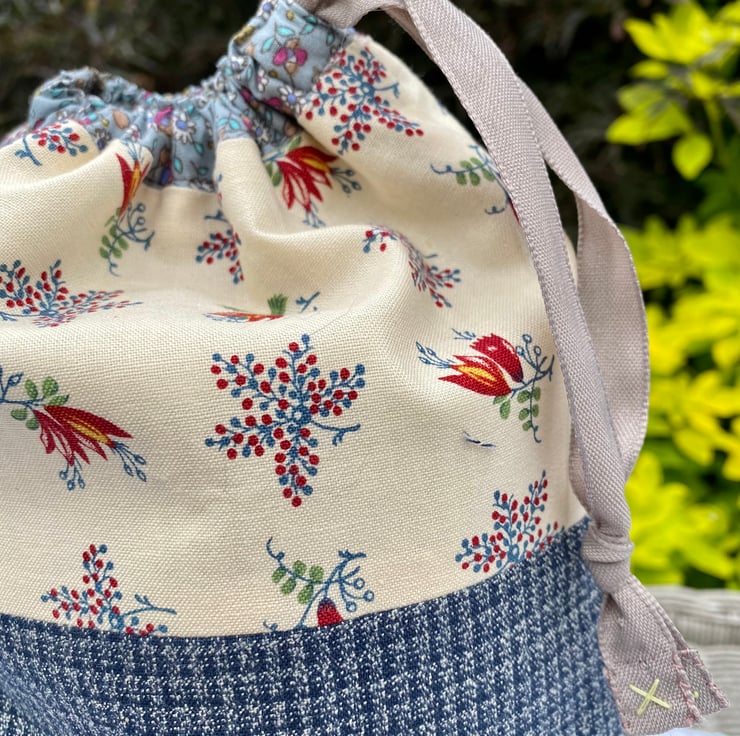 The bag is fully lined and I added a single coffee coloured drawstring closure to the bag, the length of the ribbon is generous enabling the bag to be hung and closed tightly when desired. At the end of the tie I added some embroidery detail.