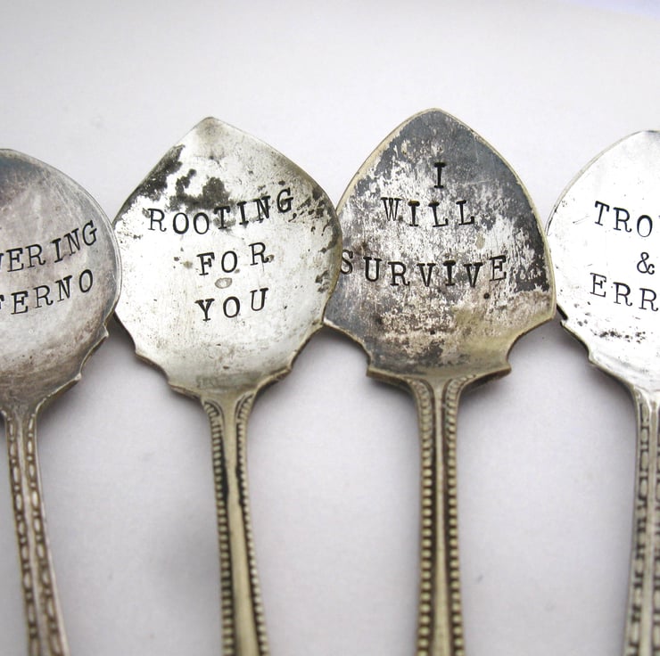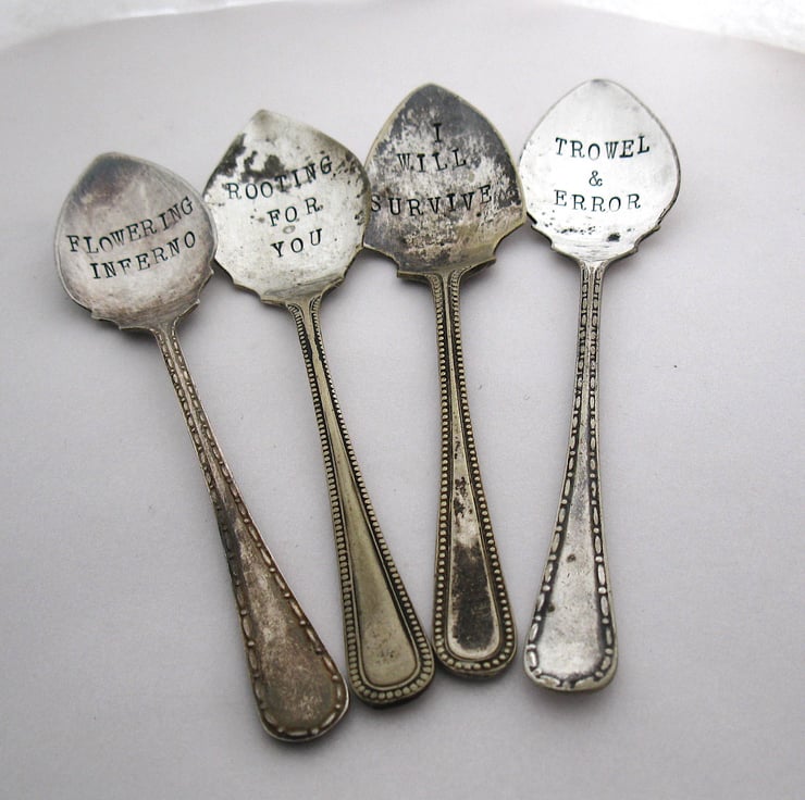 Set of four mismatched antique jam spoons upcycled into plant labels that read FLOWERING INFERNO, TROWEL & ERROR, ROOTING FOR YOU and I WILL SURVIVE. So whether you are optimistic or pessimistic about their respective futures, you'll be able to tell your seedlings apart!