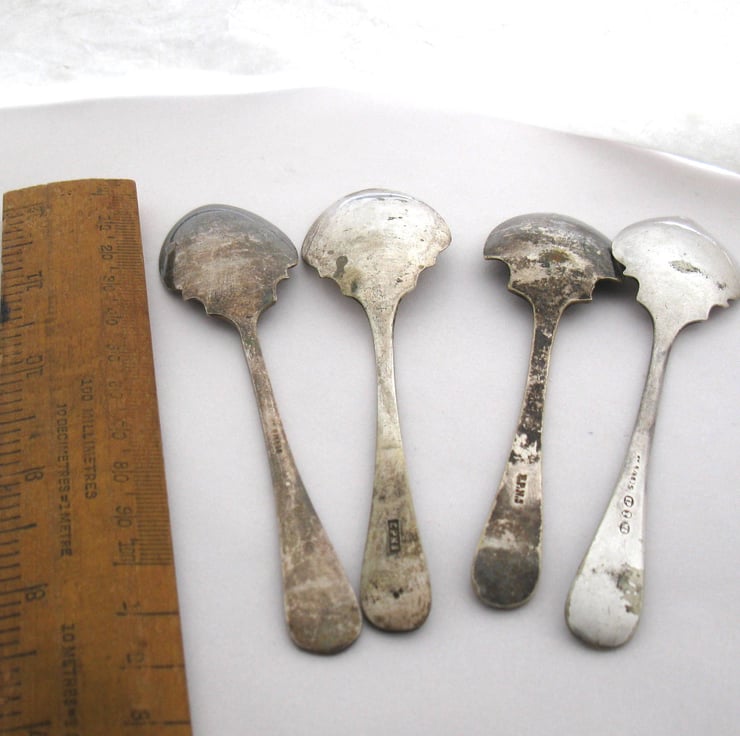 These are smallish teaspoon-sized spoons (13-14cm) and not suitable for food use, but they will take no harm from being stuck into the soil and the ink in the lettering is water-based so it won't affect your plants. You will receive the four spoons shown in the pictures and yes, they are very old and battered.