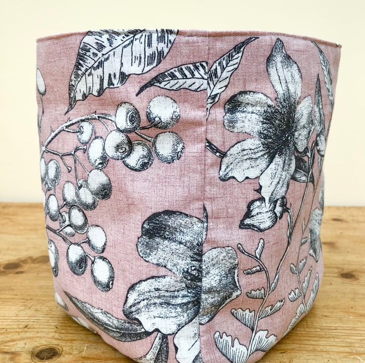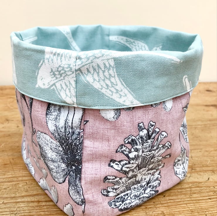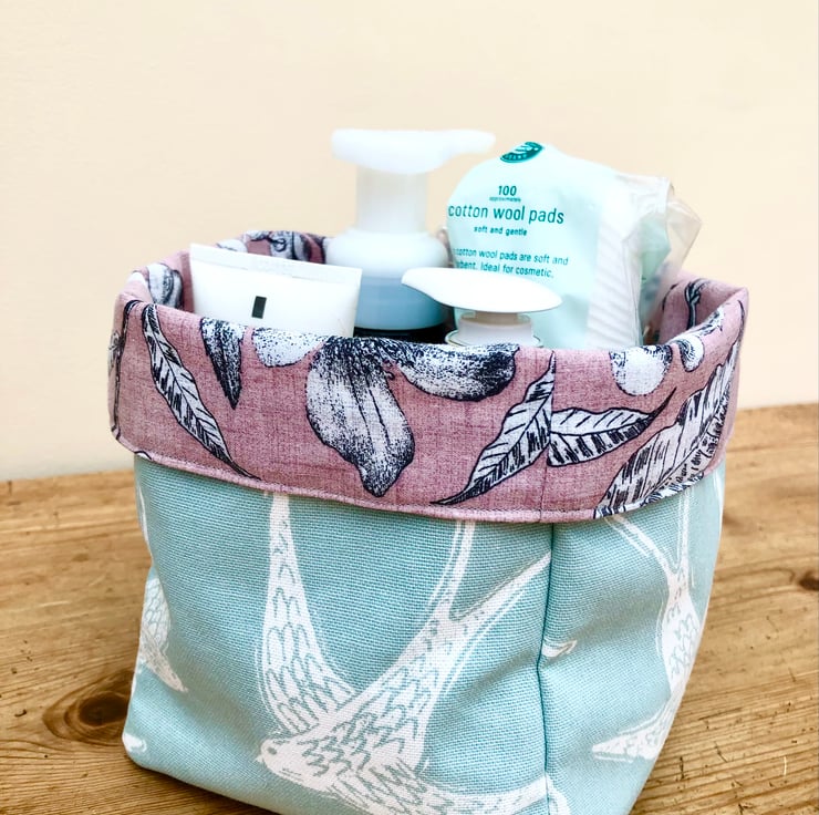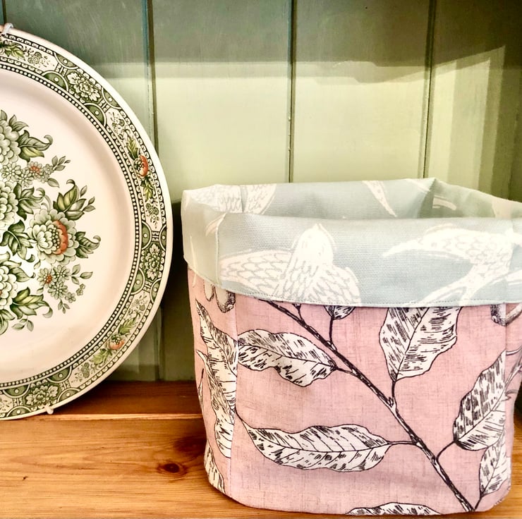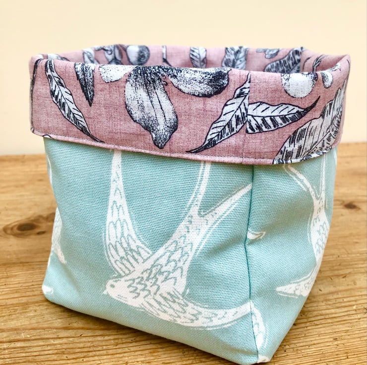 Beautiful swallow print fabric from Studio G with a pink floral/leaf patterned reclaimed fabric to line the basket. The basket is reversible and can be displayed with the top rolled over to show the contrasting fabric.