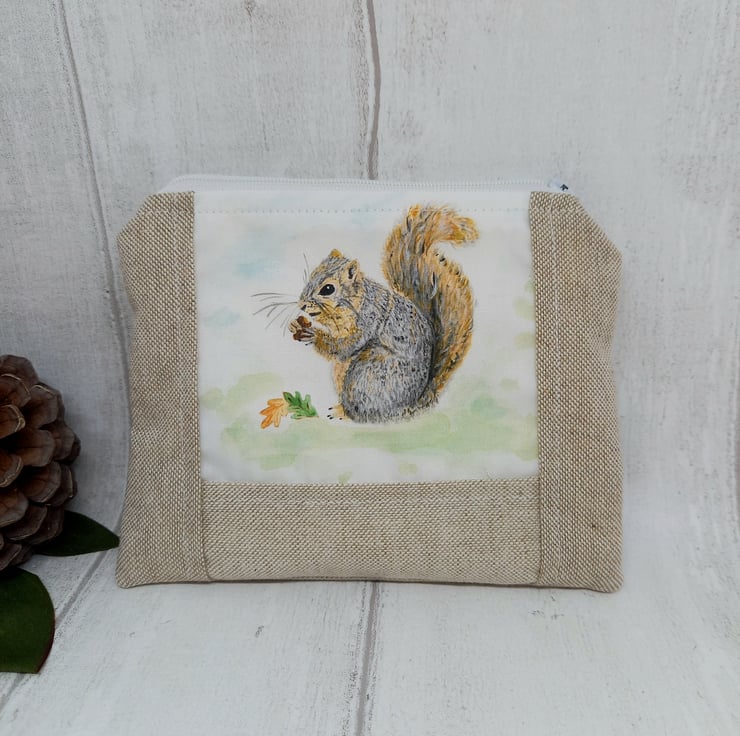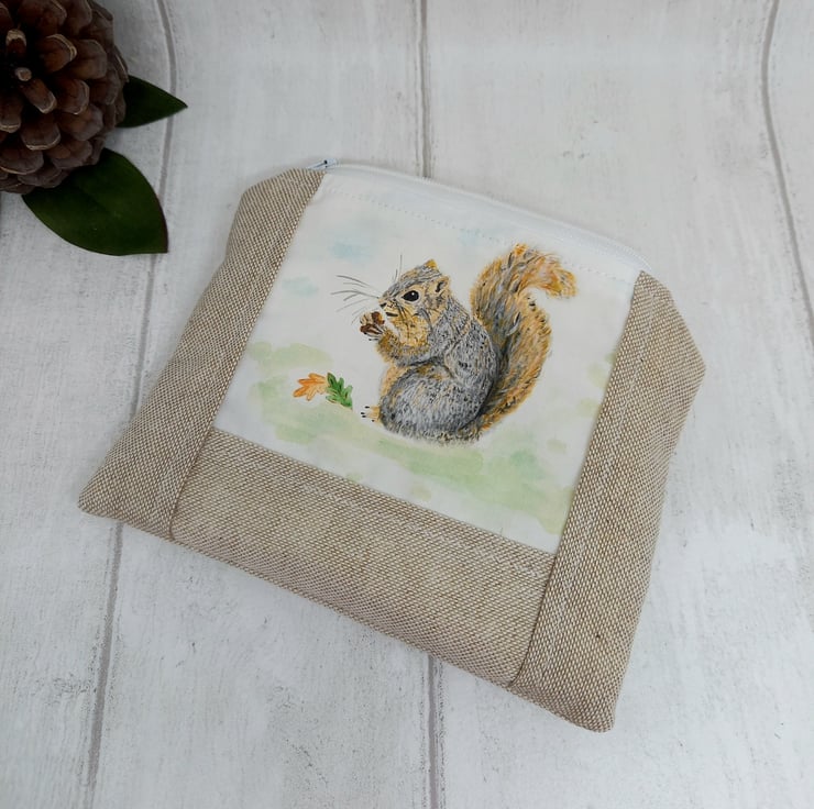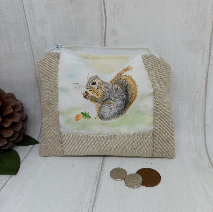 Beautiful natural linen look purse with my own original Rusty the squirrel design.