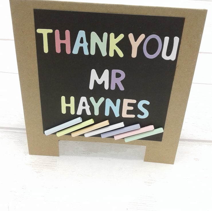 This listing is for a personalised thank you card, in the shape of a black board, plus envelope.