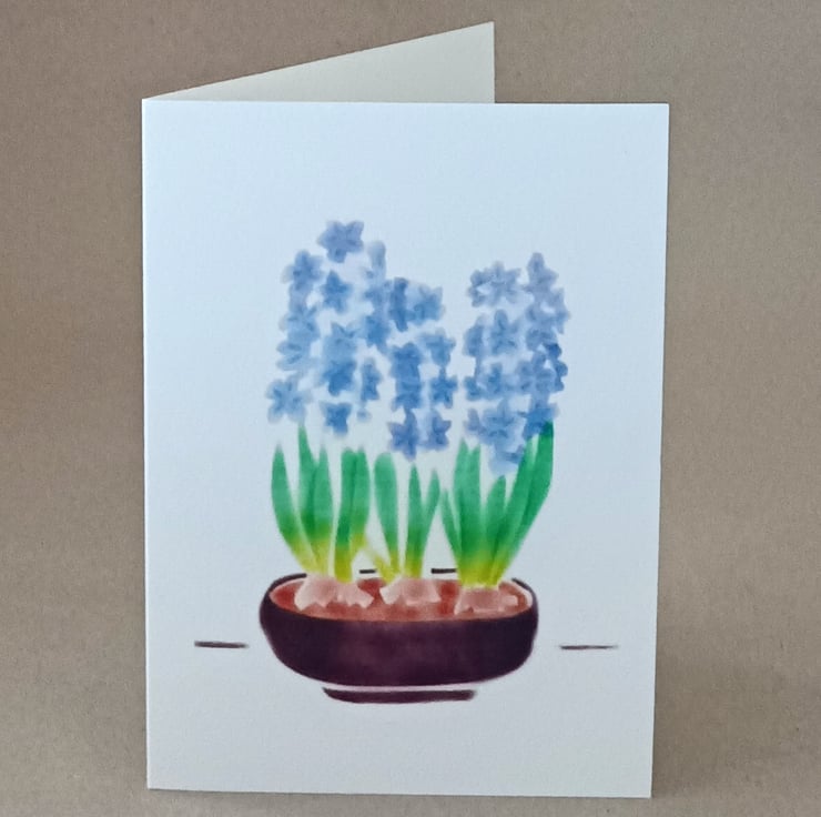 The image on this handmade card is of a bowl of potted hyacinths, a classic spring flower, in which you can just see the tops of the bulbs as well as the earth in the pot. I drew this from life and then made hand cut stencils so that I could airbrush the original design from the stencils onto paper. The ink is no longer available. So I scanned the design and now print this botanical art card with Epson Claria inks with an inkjet printer onto 190 gsm digital fine art English watercolour paper. A medium weight paper with a lightly textured felted surface.