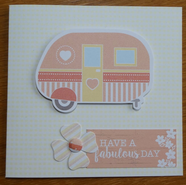 The cards all have a retro feel and have images of an old style caravan, flowers or campervan in shades of yellow, orange, blue and white on a base of yellow checked card.