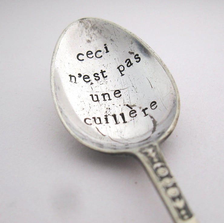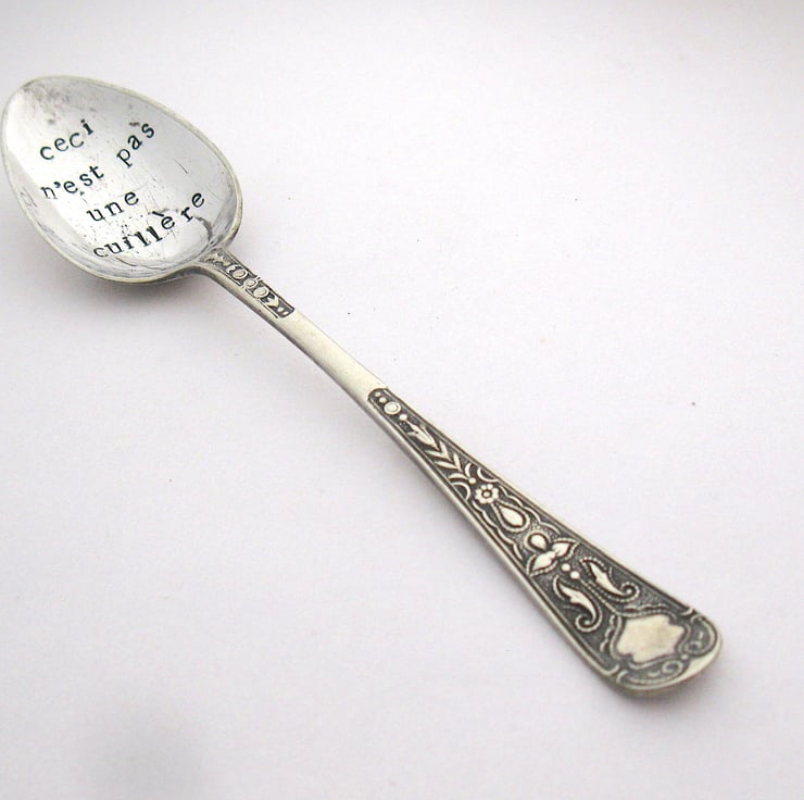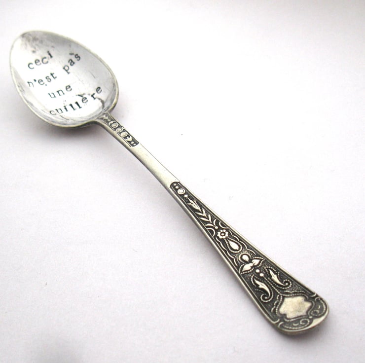 A hand stamped vintage silver-plated tea spoon with wording inspired by Rene Magritte's masterpiece 'The Treachery of Images'. Is it or isn't it a spoon? Is it still a spoon if it says it isn't one? Is the inscription true, or not? Is it Art? Either way you can stir your tea with it so ultimately these questions are of purely intellectual interest. It's an ornately patterned teaspoon measuring approximately 13.5cm long and I would guess it's Victorian.