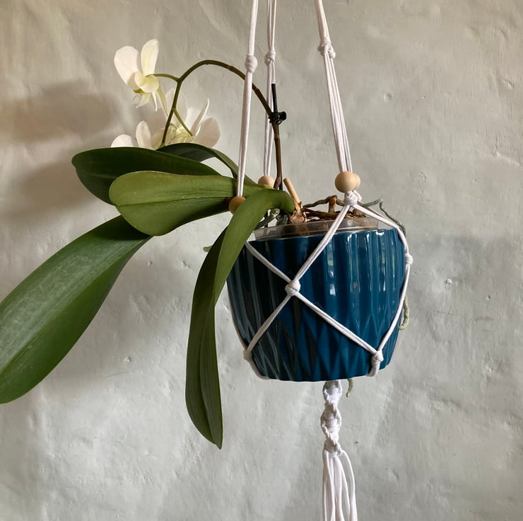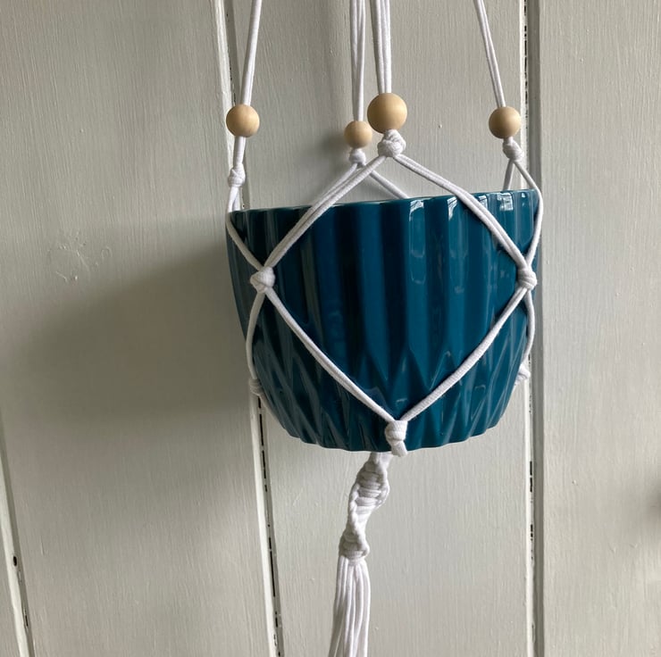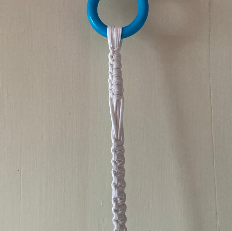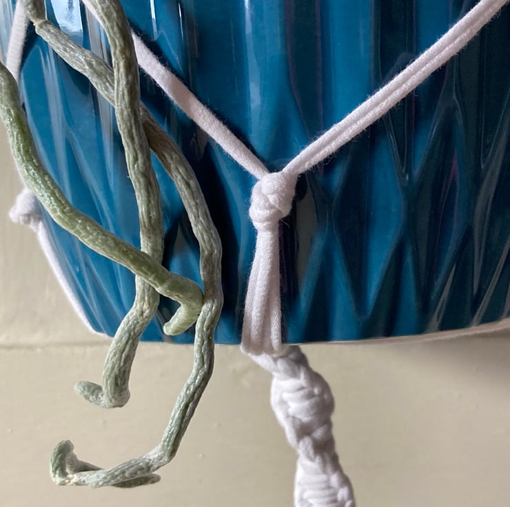 This plant holder has been made using the tee shirt yarn formed from an unloved white, England tee shirt, combined with a ‘surplus to requirement’ curtain ring which has been painted turquoise. Macrame knotting techniques have been used, creating flat and spiral knots and simple wooden beads have been added for decoration. The photos help to show some of the details although this is a difficult item to photograph!