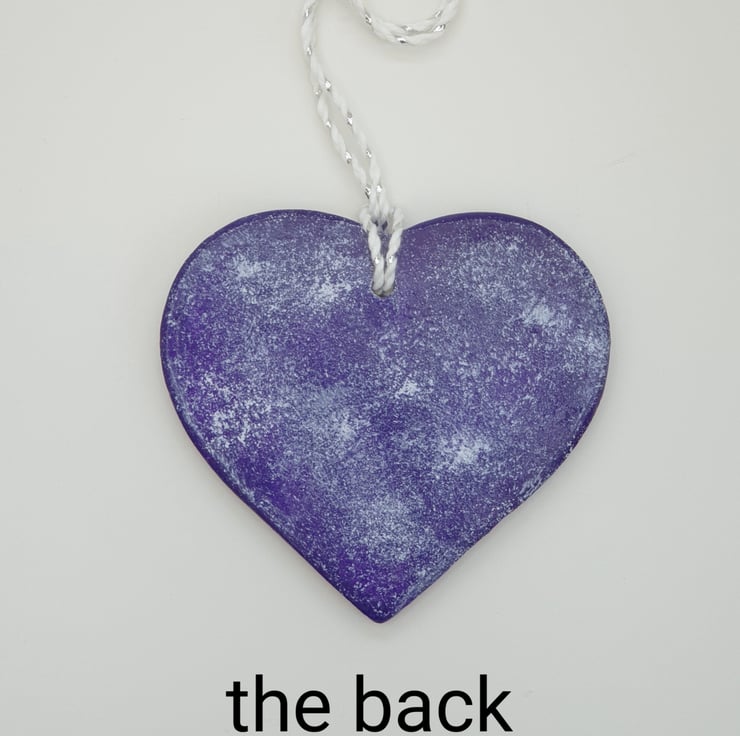 Pretty hanging heart decoration lovingly made from air dry clay and embossed with a lace pattern and coloured with purple acrylic paint. The back of the heart has been left smooth and painted with a mottled pattern. Ready to hang from white and silver twine this decorative heart would look lovely displayed in a window or hung from a handle or piece of furniture and would make a pretty gift for a Birthday, Valentines, Mother's day or an anniversary.