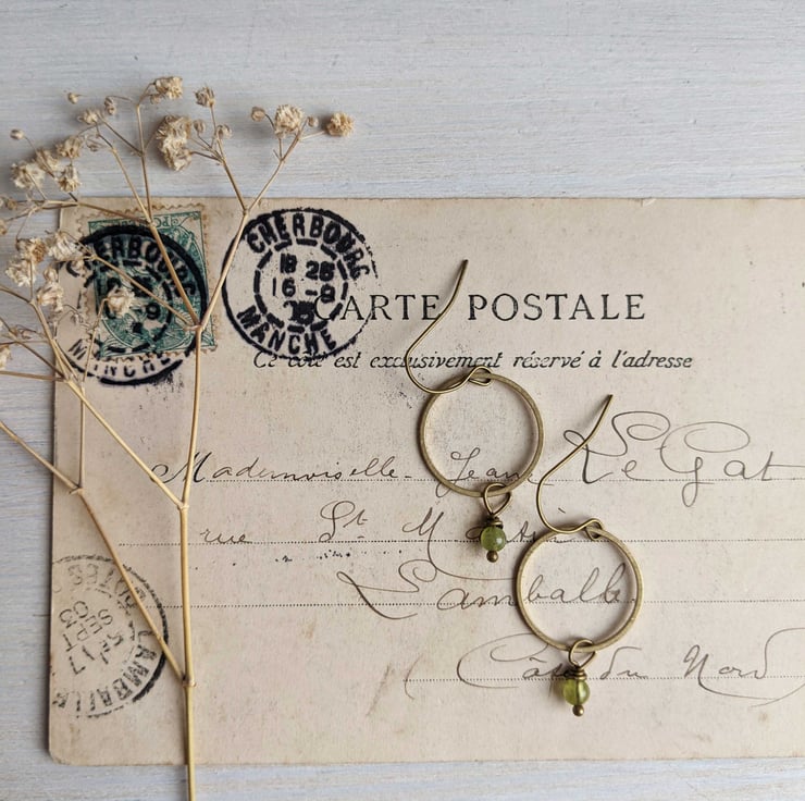 Beautifully fine golden brass hoops, with pale green peridot gemstone drops.