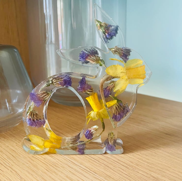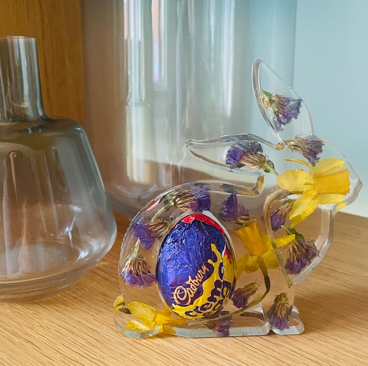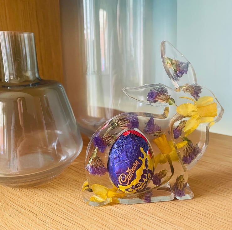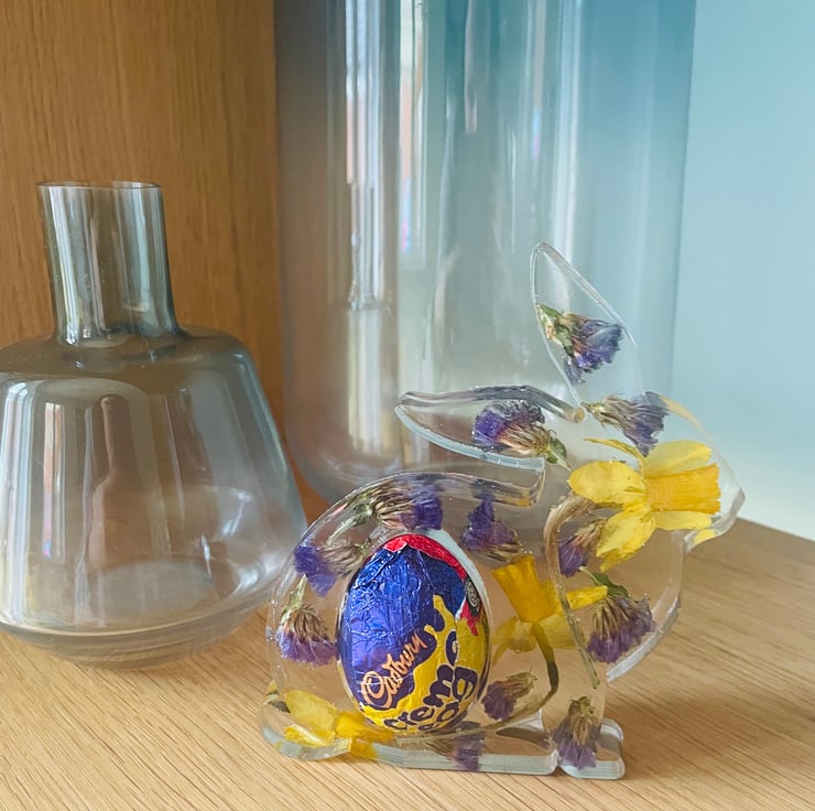 A cute resin Easter bunny with a hole to display a small chocolate egg. This bunny has spring blooms encased in clear resin with a lilac shimmery background. It makes a unique Easter gift that can be used every year as decor.