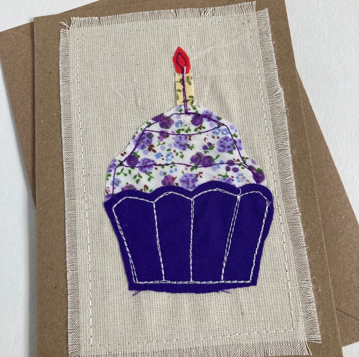 This birthday card is decorated with an appliquéd cup cake in shades of purple, sewn onto a piece of calico, previously used for a pattern fitting. The whole decoration has then been sewn on to a craft card which measures 10.5 x 15cm. The greeting inside has been stamped and embossed and simply reads ‘Happy Birthday’. The back is stamped with our logo.