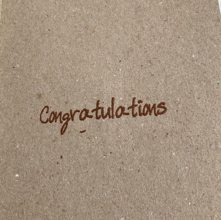 This new baby card is decorated with an appliquéd pram in shades of primary colours, sewn onto a piece of calico, previously used for a pattern fitting. The whole decoration has then been sewn on to a craft card which measures 10.5 x 15cm. The greeting inside has been stamped and embossed and simply reads ‘Congratulations’. The back is stamped with our logo.