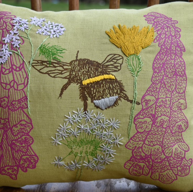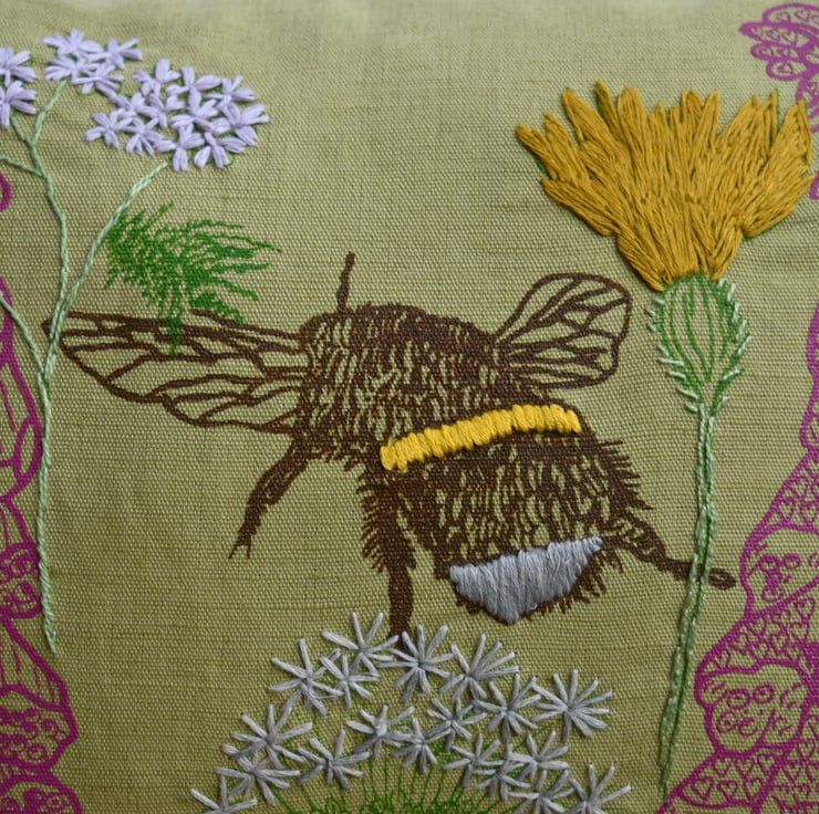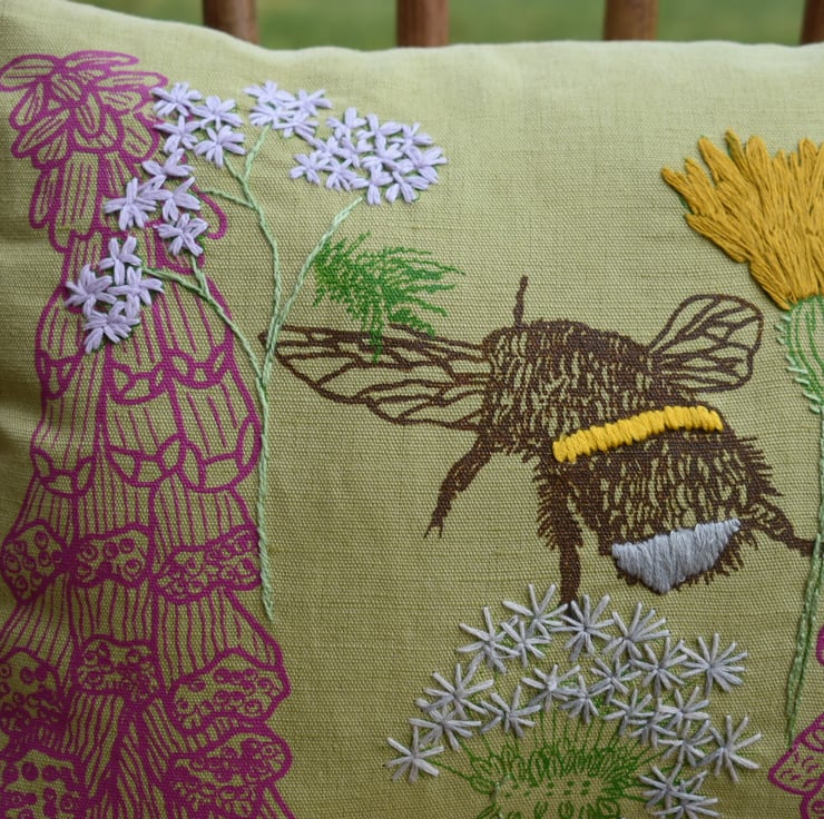 This is a green medium weight linen cushion that has been screen printed with my own designs. There is a background design of 2 foxgloves each in a different design. On top of these I have my bee and wild flower prints. The wild flowers have hand embroidery to the flowers and some stems. The bee has its coloured bands hand embroidered. There is a dandelion clock, goats beard and yarrow.