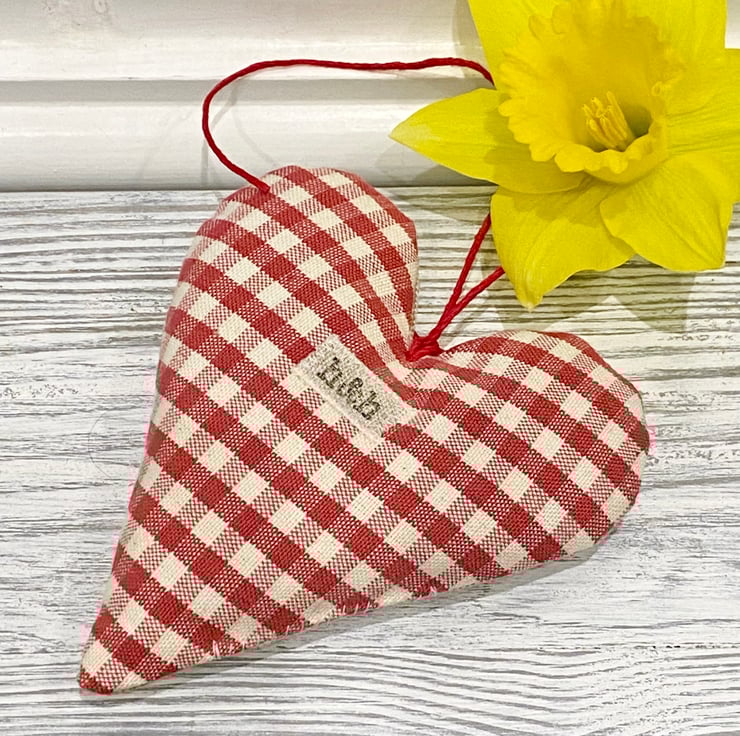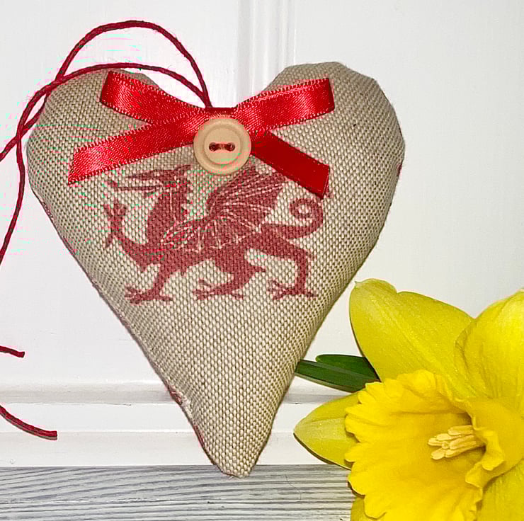 This heart decoration features the heraldic symbol of Wales - the Red Dragon - on the front, with a toning reverse side in red and white gingham. Generously filled with either beautifully fragrant lavender or plump with toy grade stuffing, and finished with a round wooden button, a red satin ribbon bow and red hemp twine hanging ties.