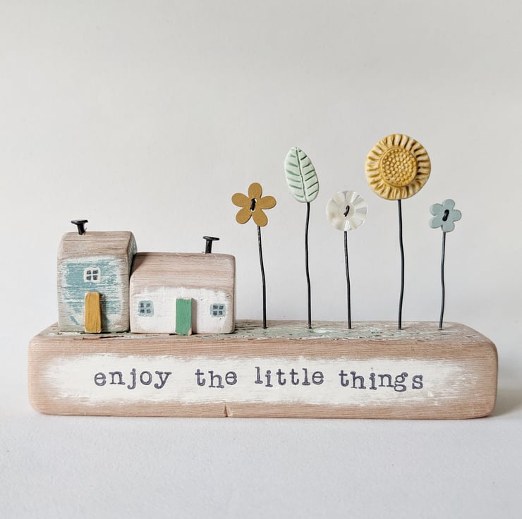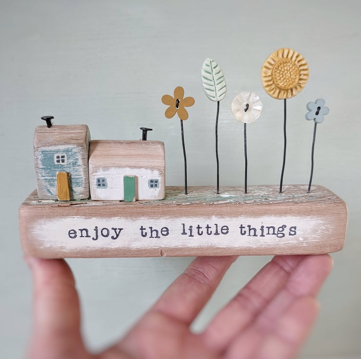 Hand stamped on the front are the words 'Enjoy the little things'.