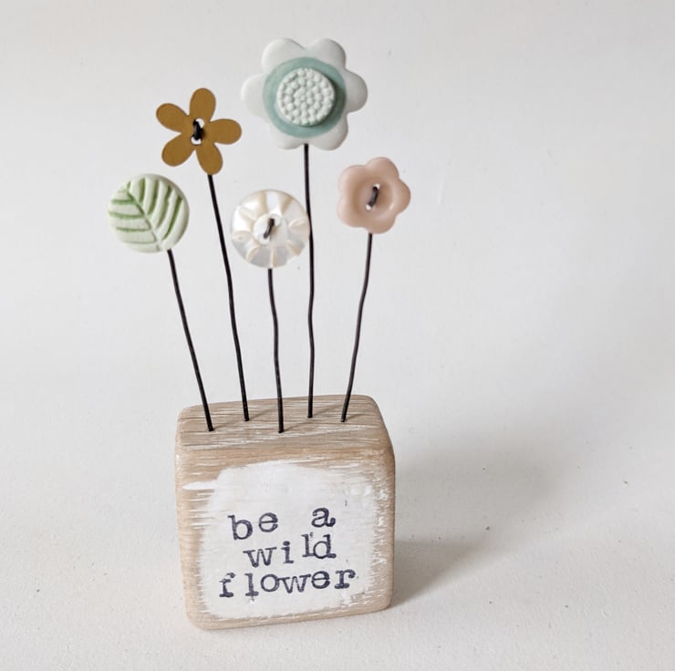The front of the wooden block is hand stamped with the words 'be a wildflower.