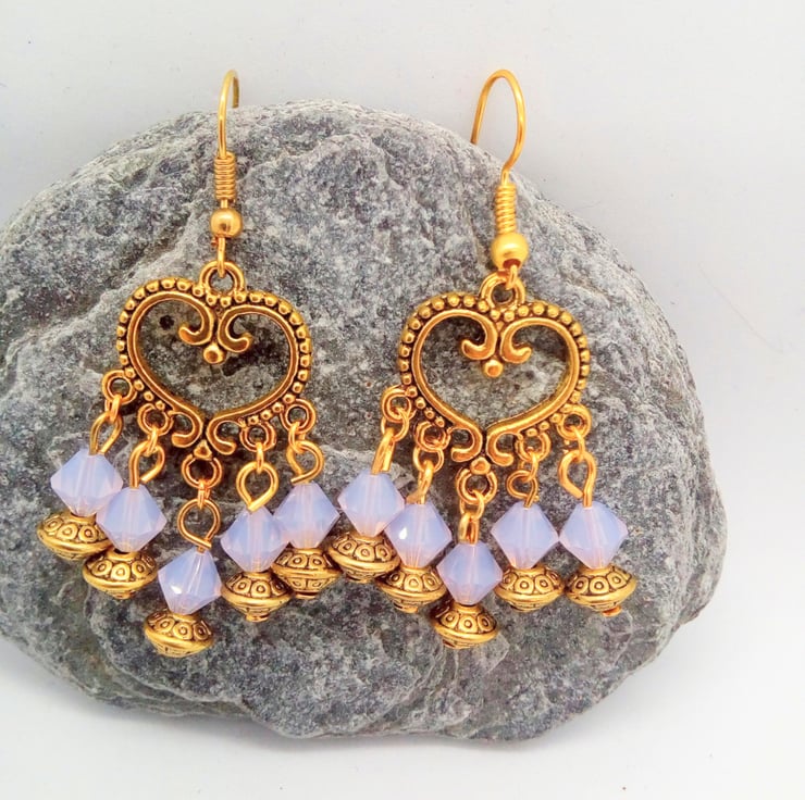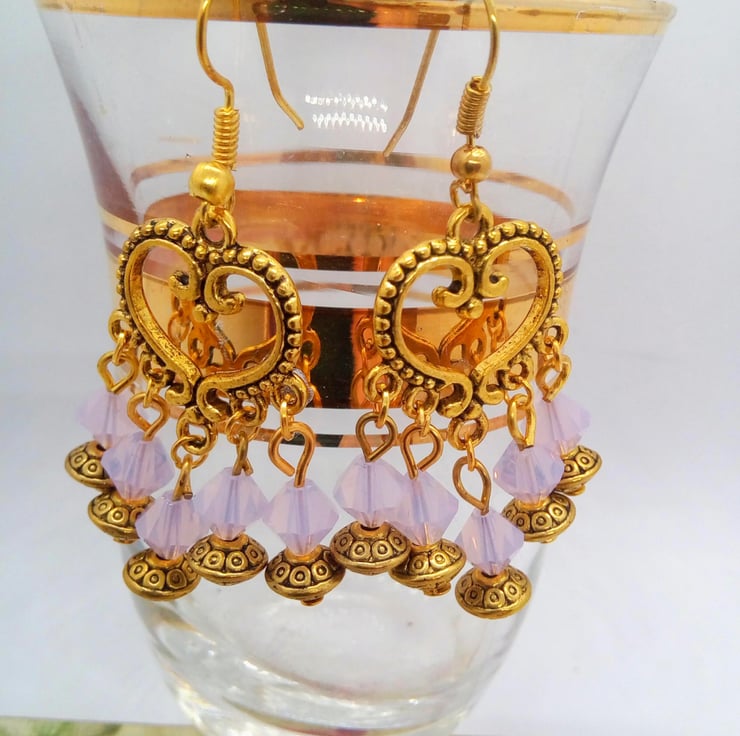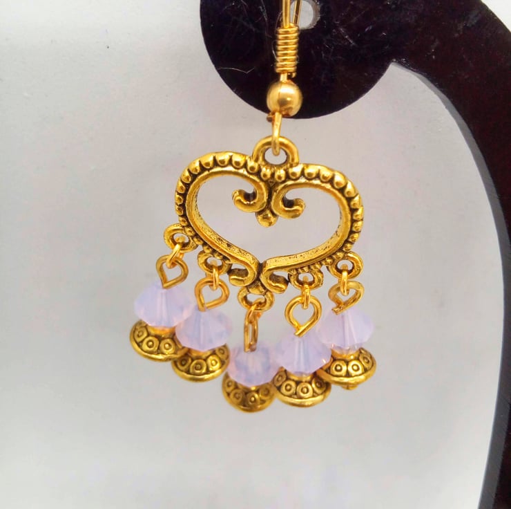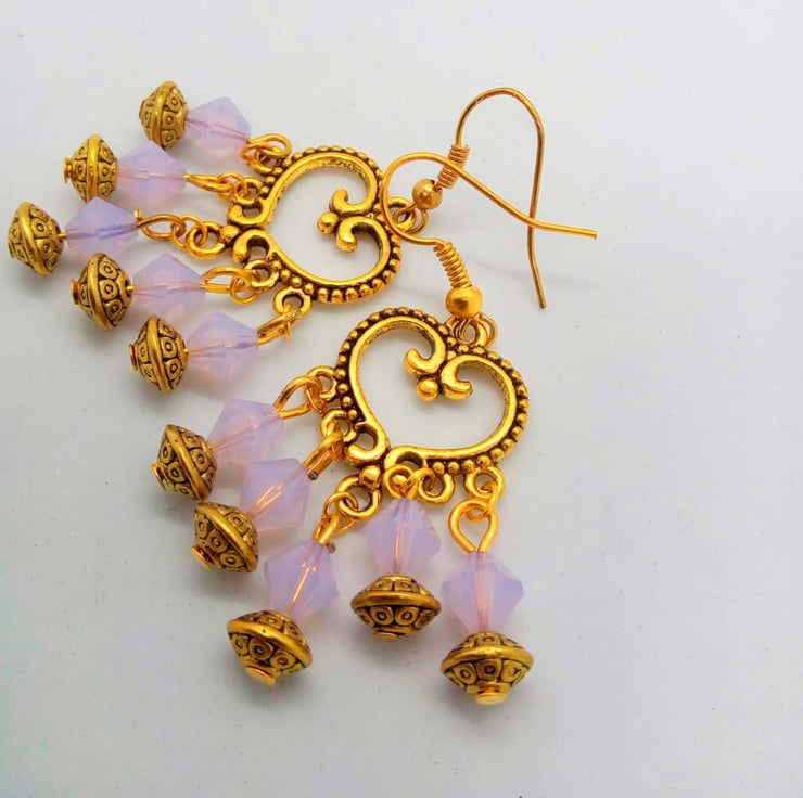 The earrings are made using 6mm opaque pink crystal bicone beads and 6mm gold plated spacer beads all on a gold plated heart connector hung on gold plated ear hooks and they have a drop of 3.5 cm.