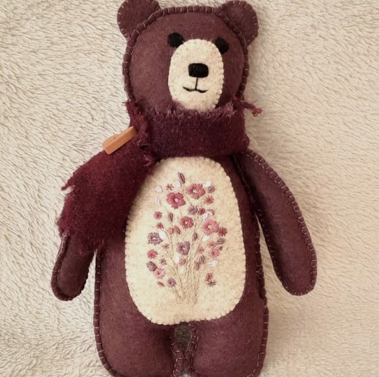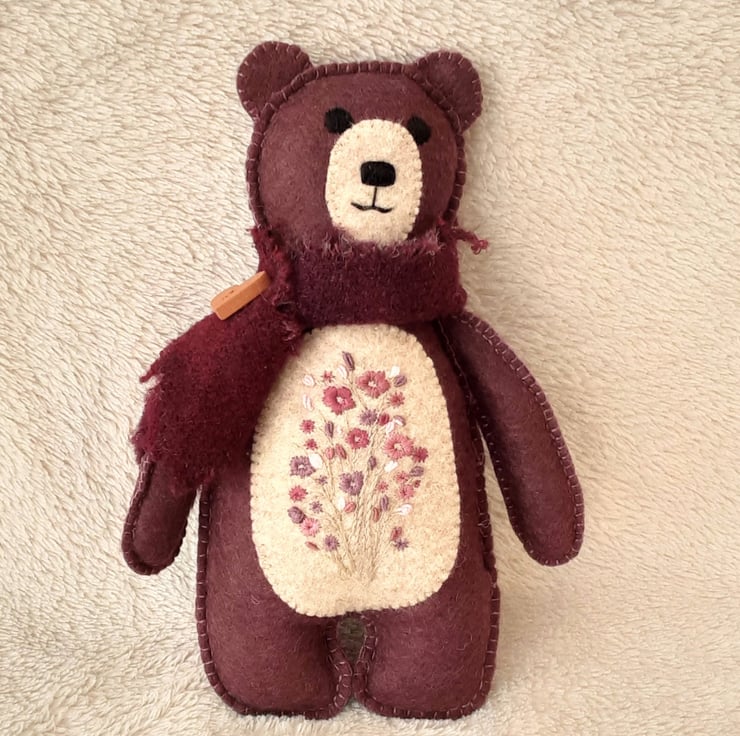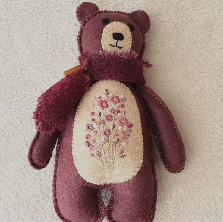 A hand embroidered and hand sewn teddy bear gift, woodland scandi style felt bear keepsake gift designed and created by Bearlescent