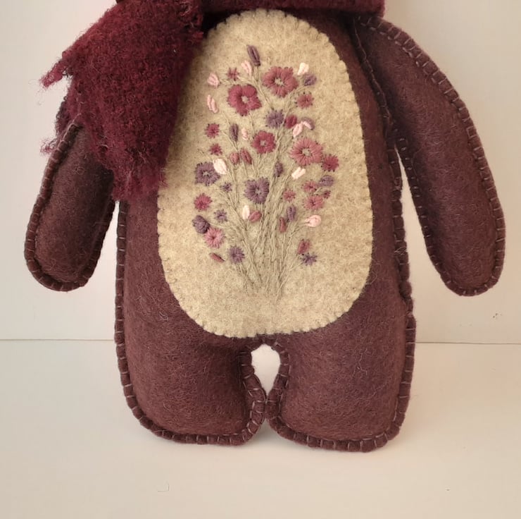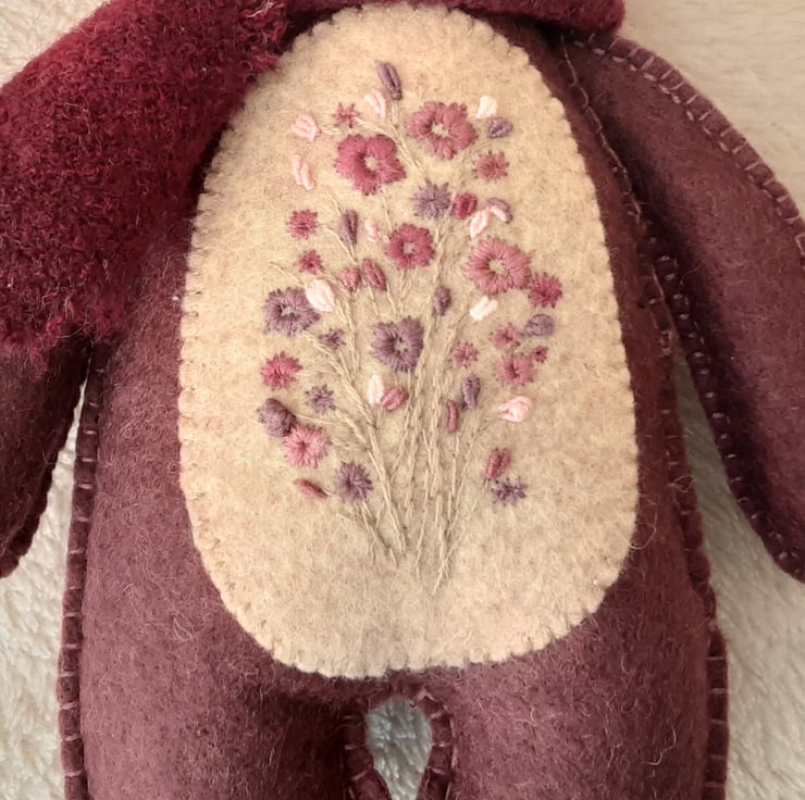 His contrast tummy area has been hand embroidered in a unique floral design in deep pinks/plums onto pale lichen mottled wool felt.