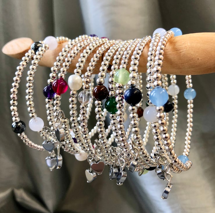 Four clear quartz beads with silver plated spacer beads on a memory wire bracelet with heart charm. Fits most adult size wrists.