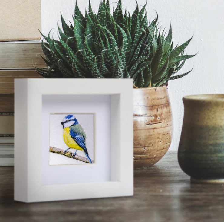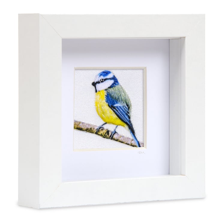 Bluetit - a hand embellished, textile print, which I have carefully stitched and framed in a small box frame.