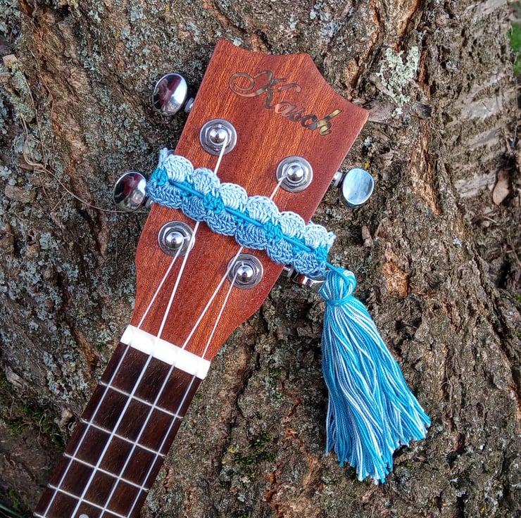 Pretty, boho, hand-crocheted ukulele head stock wrap. Made in a fancy, shell-like stitch in a choice of vibrant colours to match your mood, personality, playing style or uke strap.