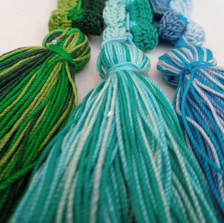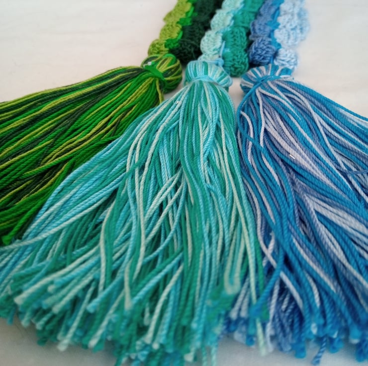 Each is crocheted in three shades of bright cotton thread and adorned with a gorgeous, flippy-floppy, hand-made tassel in matching colours.