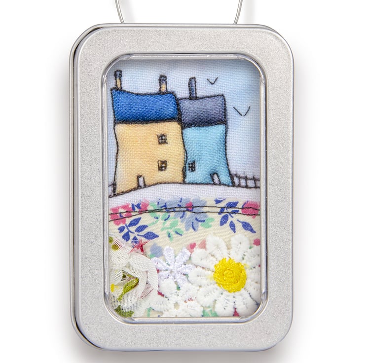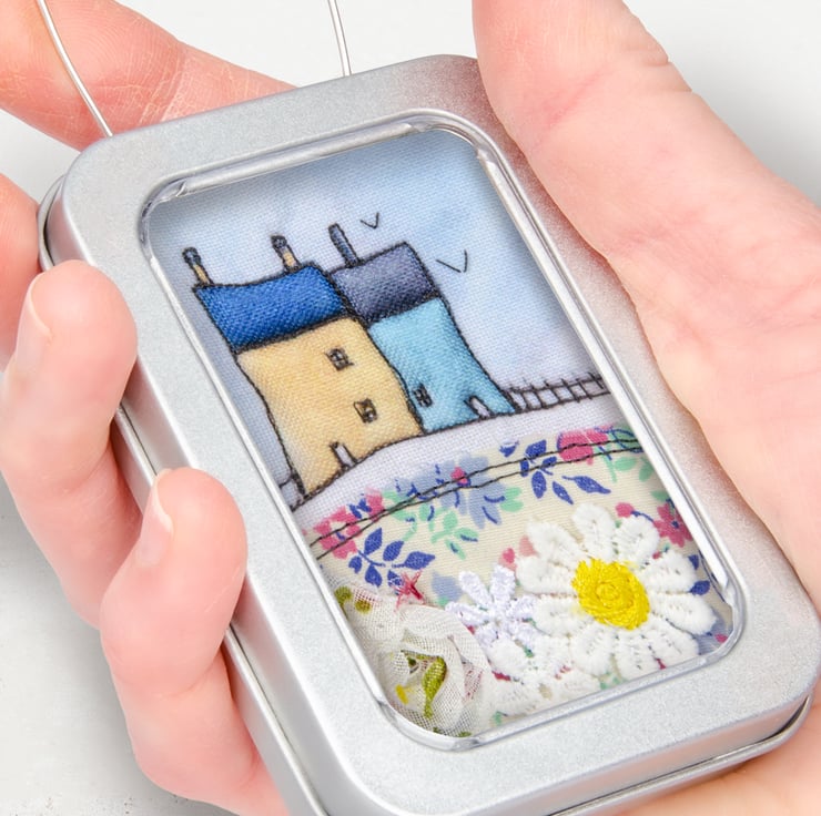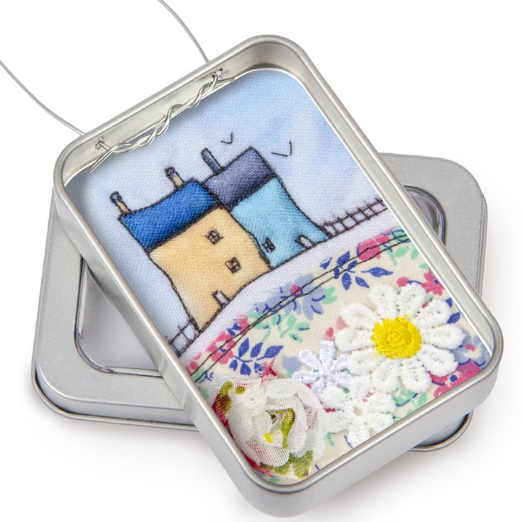 This is a little 3D fabric picture of cottages, framed in a sturdy recyclable aluminium tin, with a wire hanger.