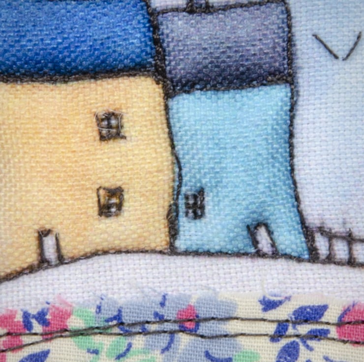 An embellished fabric print, carefully machine stitched and slightly padded, to give an unusual three-dimensional appearance. I have added the details with hand-embroidery.
