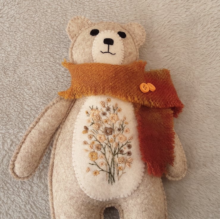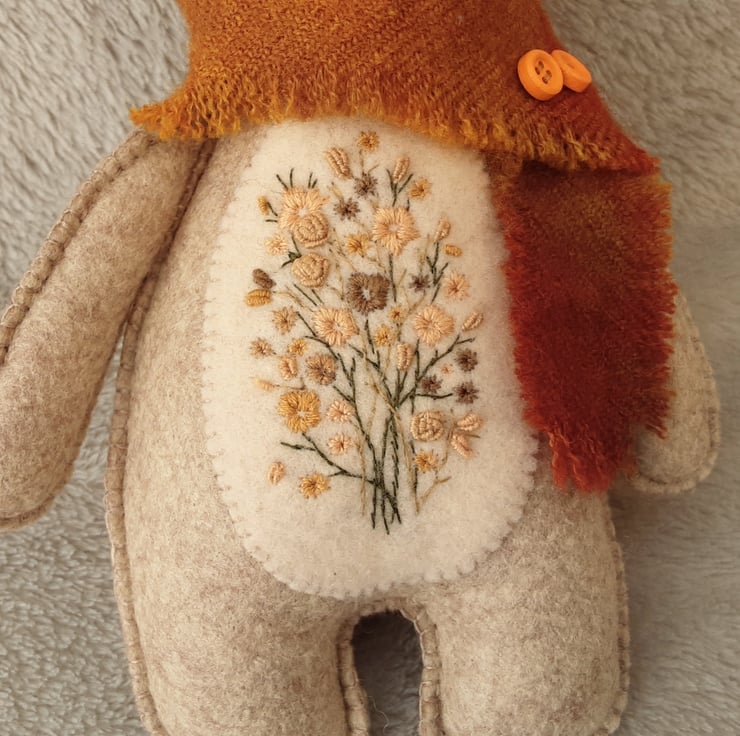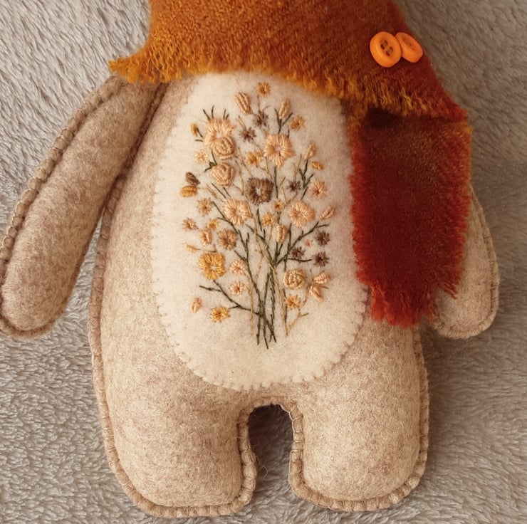 His contrast tummy area has been hand embroidered in a unique floral design in golds, mustards, peaches, greens and dark moss colourings onto natural wool felt.