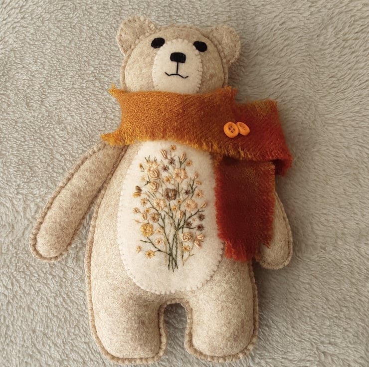 Teddy is finished with a scarf made from hand dyed wool fabric in lovely Bright oranges/burnt oranges which I have finished with two tiny bright orange buttons.