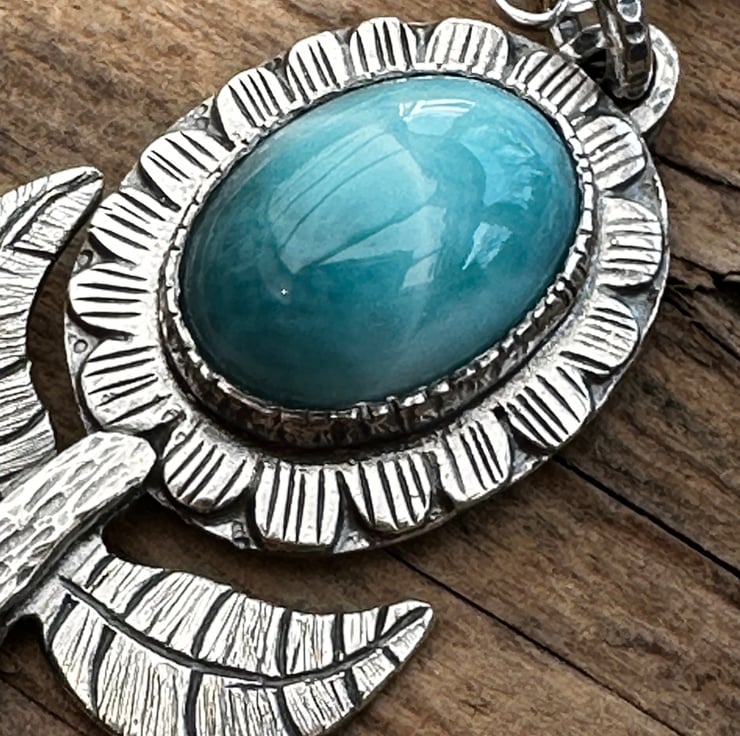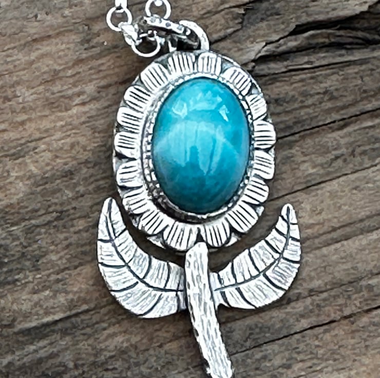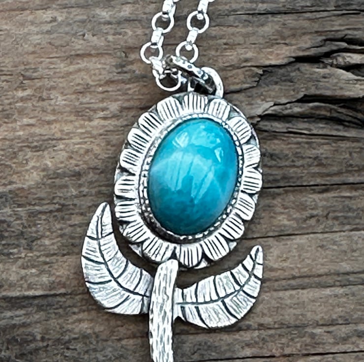 I have enjoyed making this flower pendant, using traditional jewellery making tools; piercing out metal with my jewellers saw, soldering, adding detail and texture with stamps and setting a beautiful Larimar cabochon. The flower has an oxidised finish.