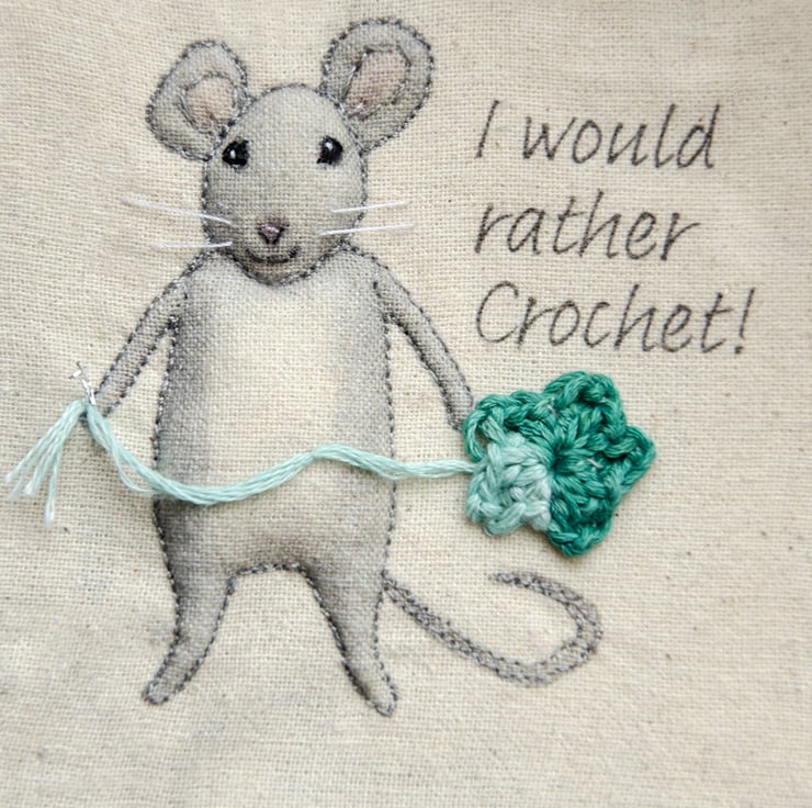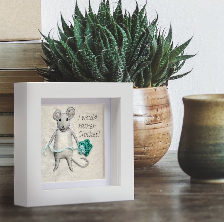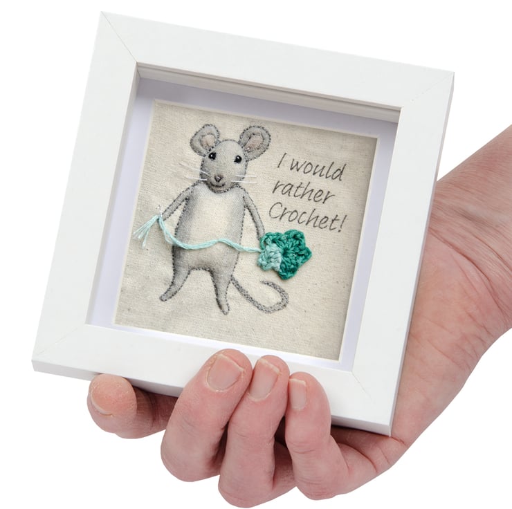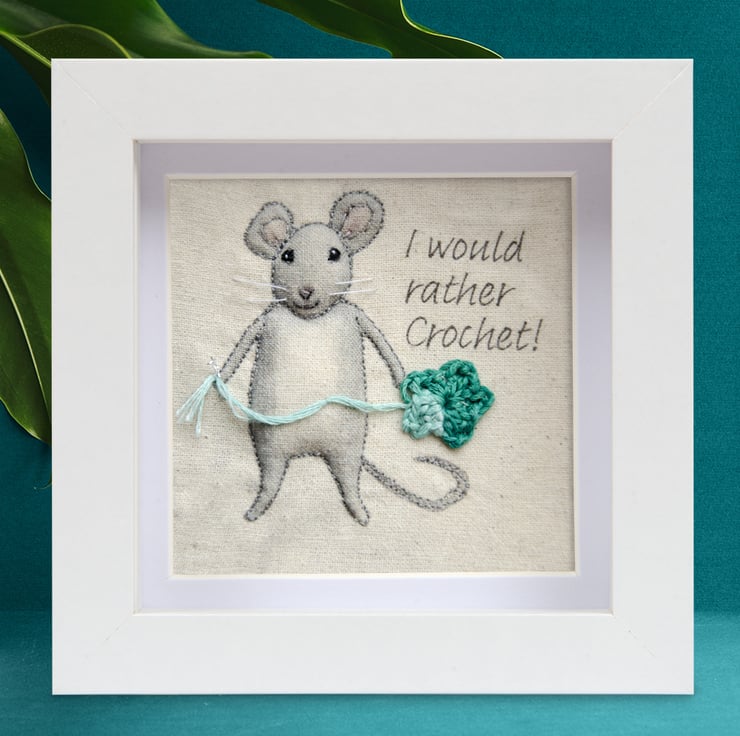 little crocheting mouse - a hand embellished, textile print, which I have carefully stitched and framed in a small box frame