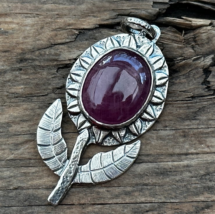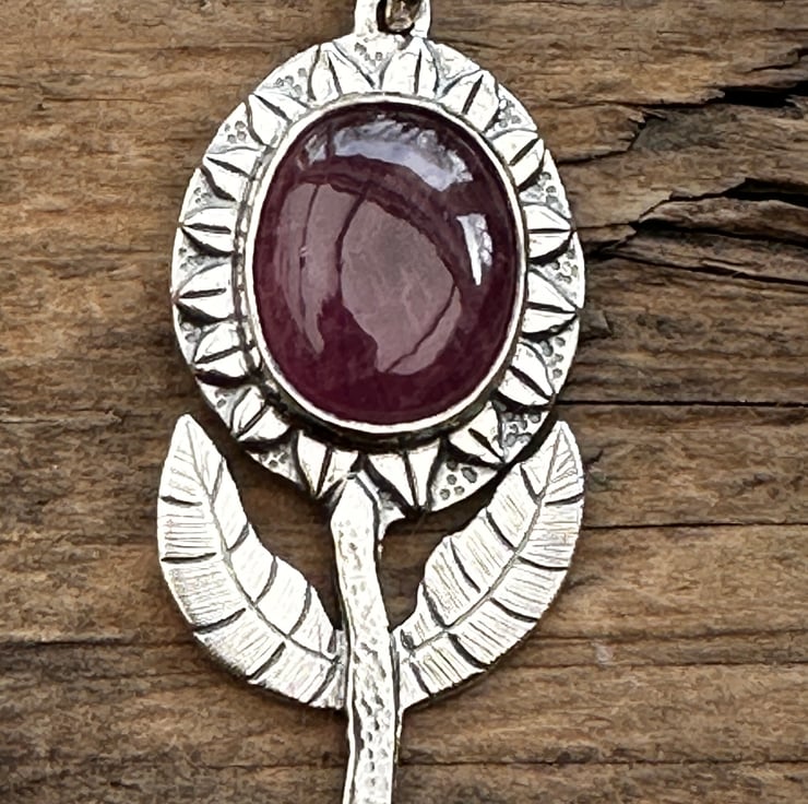 I have enjoyed making this flower pendant, using traditional jewellery making tools; piercing out metal with my jewellers saw, soldering, adding detail and texture with stamps and setting a beautiful Ruby cabochon. The flower has an oxidised finish.