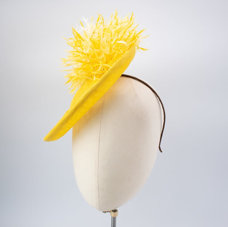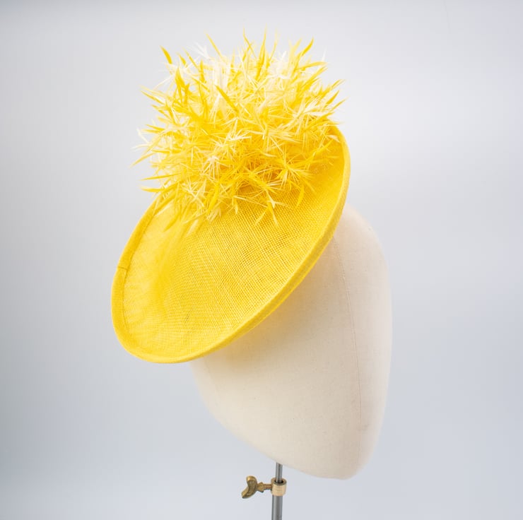 A disc fascinator in a warm yet vivid yellow, trimmed with a mass of hand-dyed goose feathers for an elegant and eye-catching display. Perfect for race days like Royal Ascot, weddings and summer garden parties.